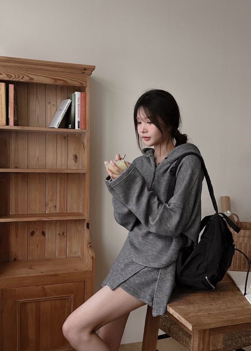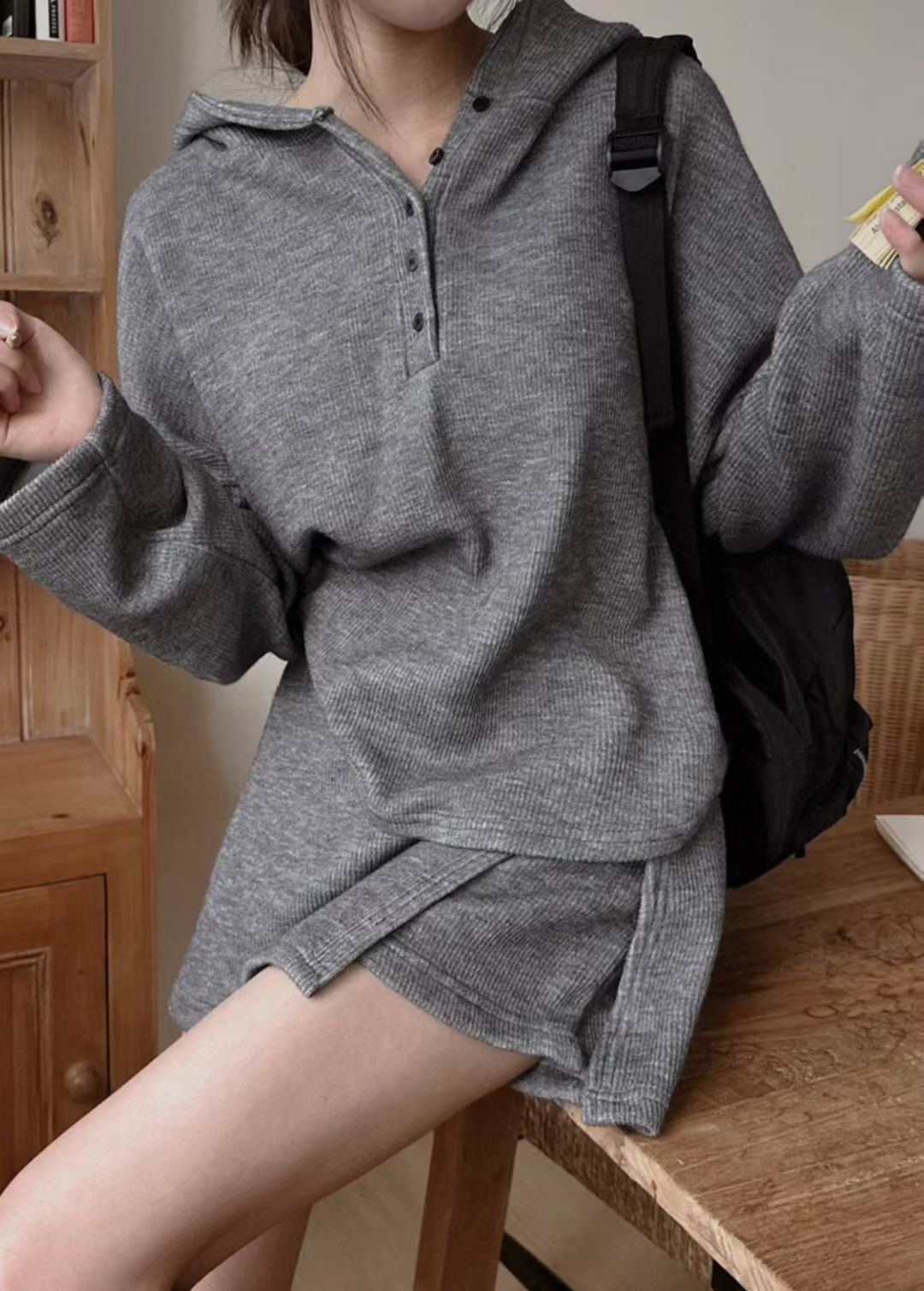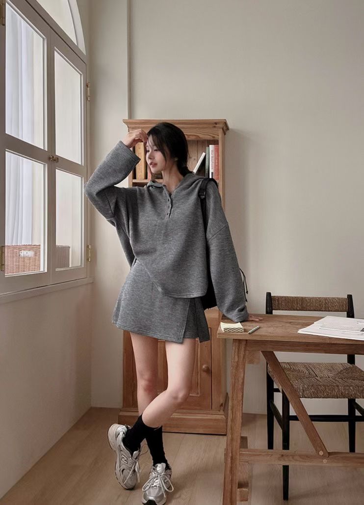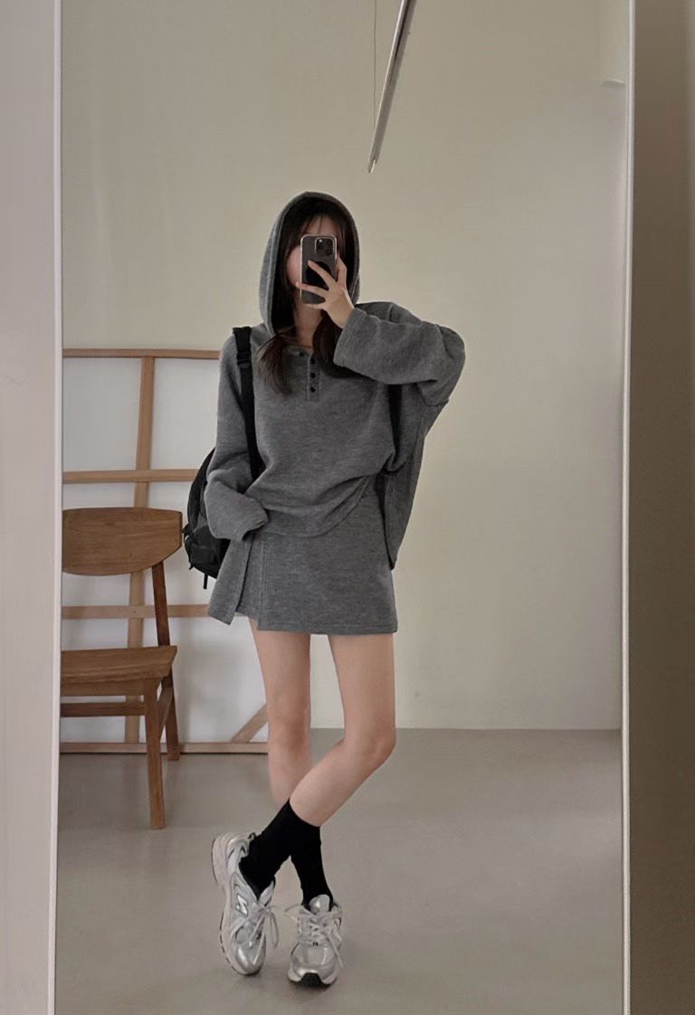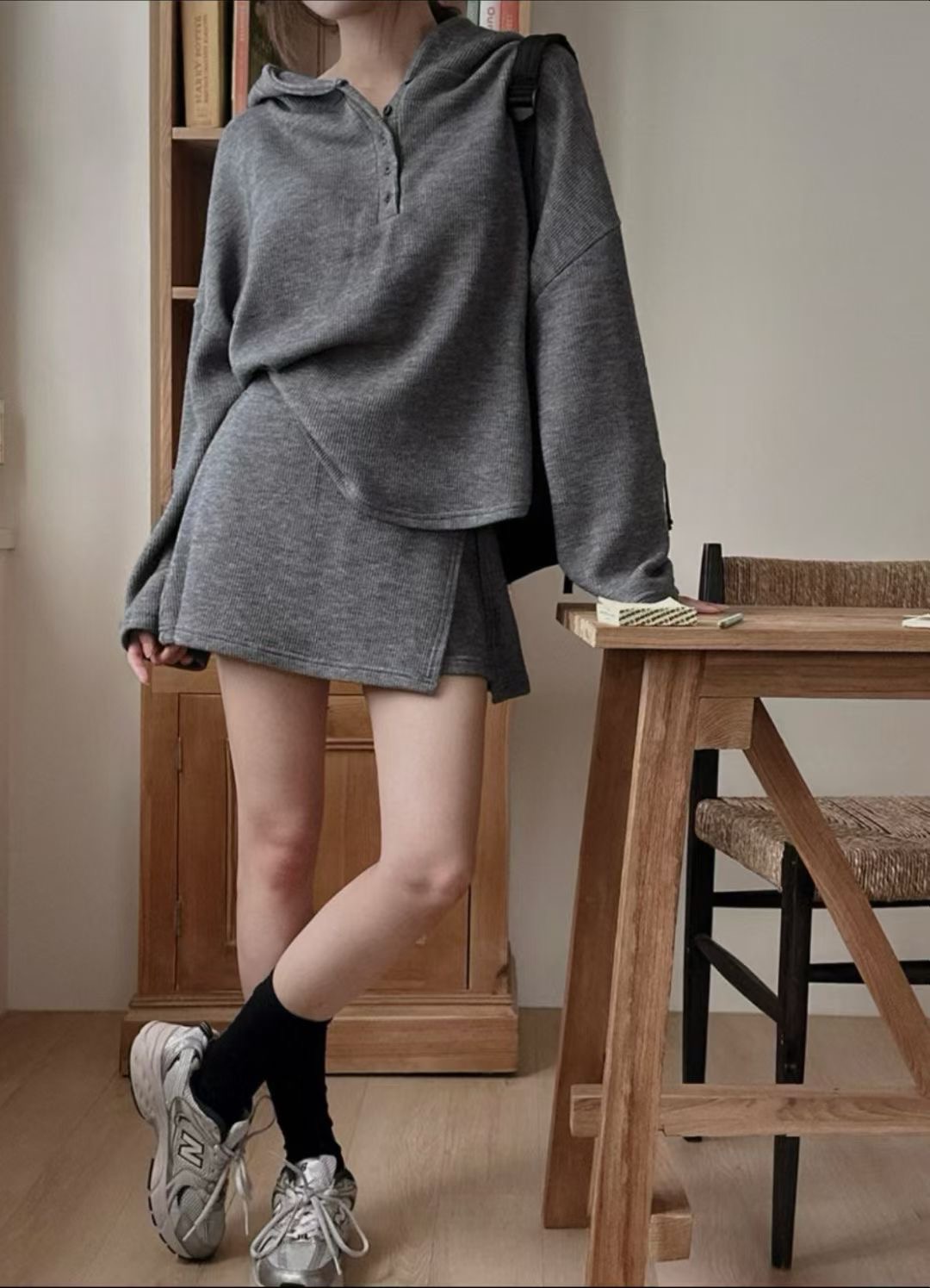 排釦連帽針織衫+鬆緊開衩褲裙SET