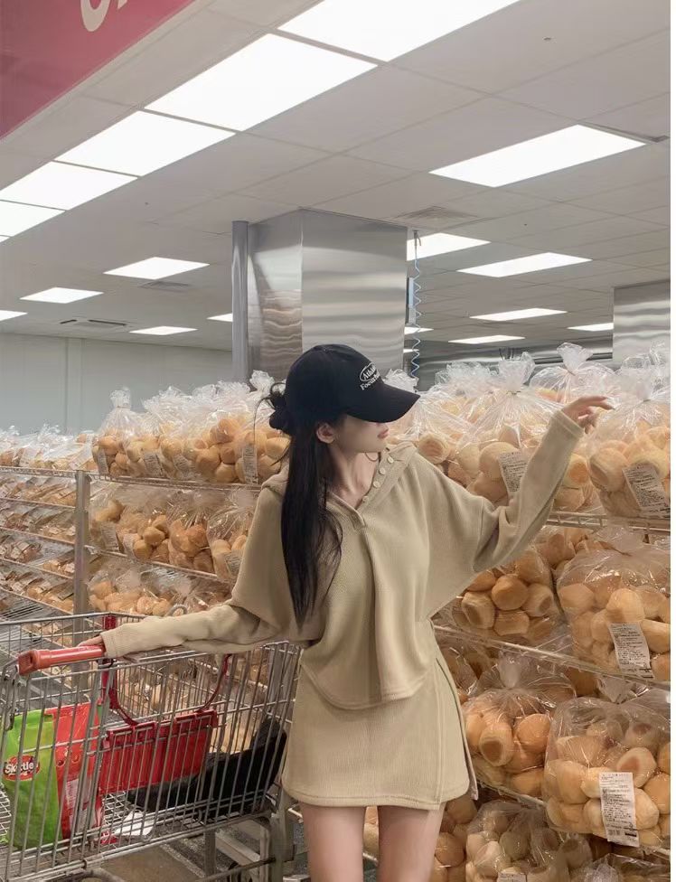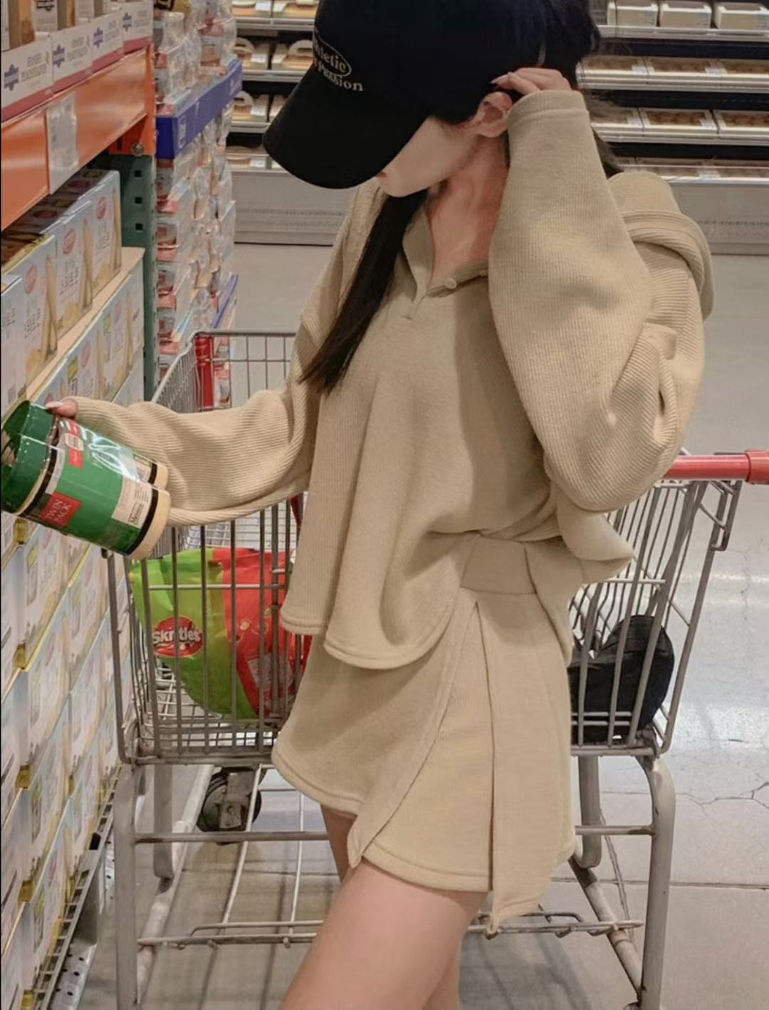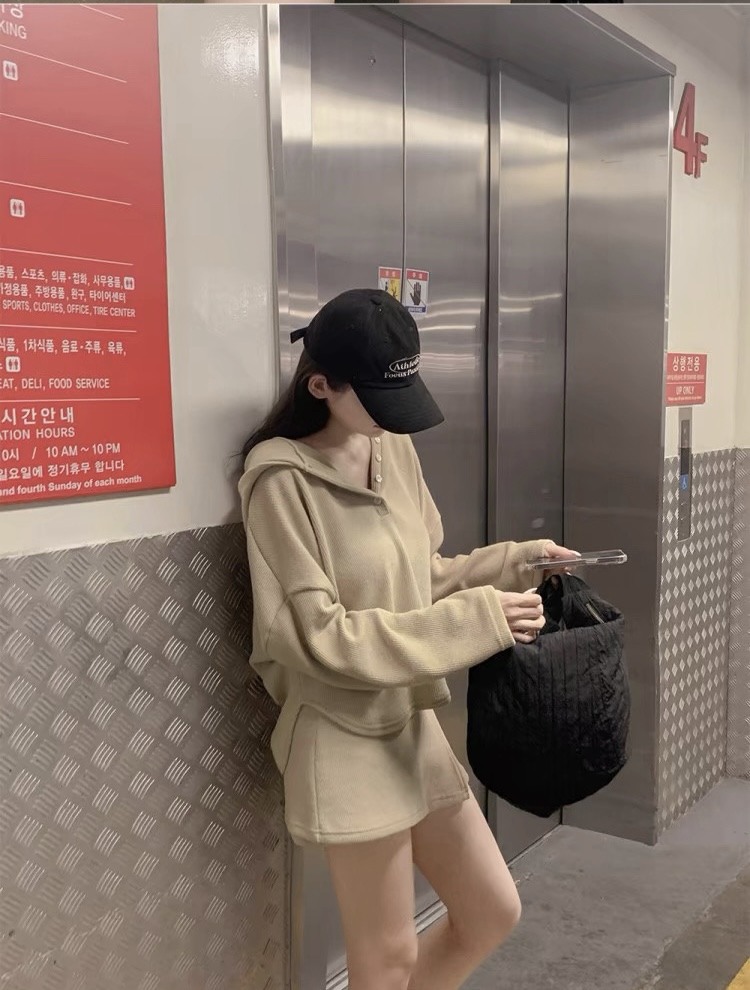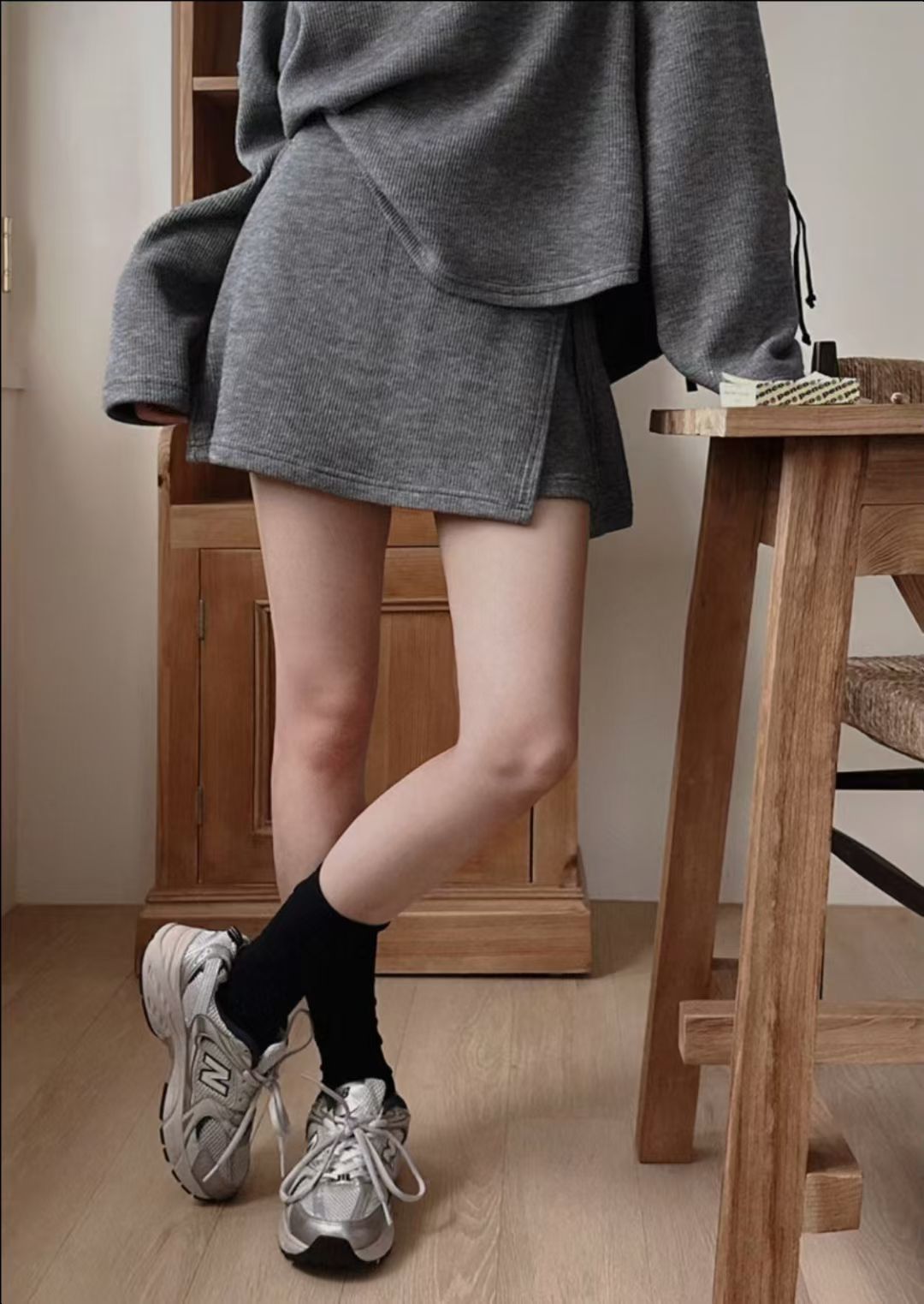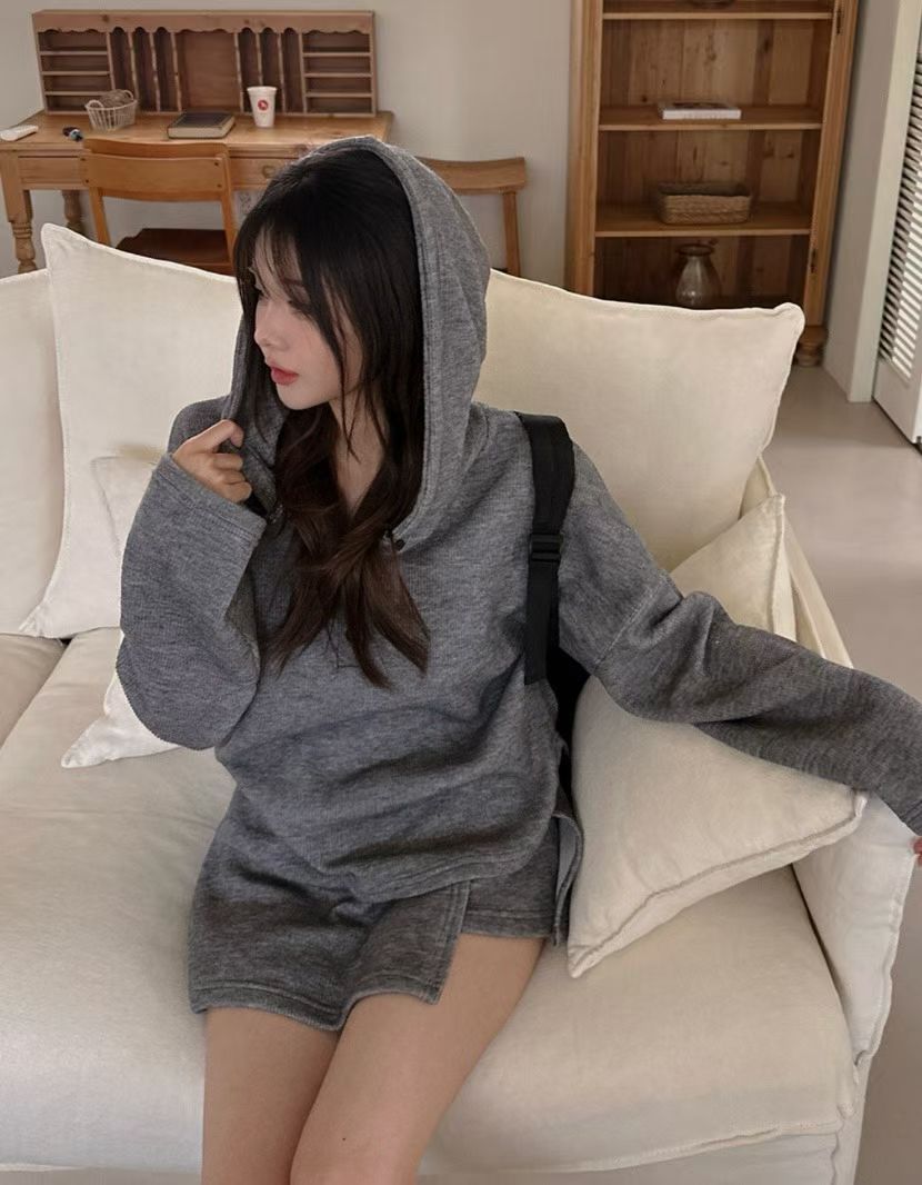 排釦連帽針織衫+鬆緊開衩褲裙SET