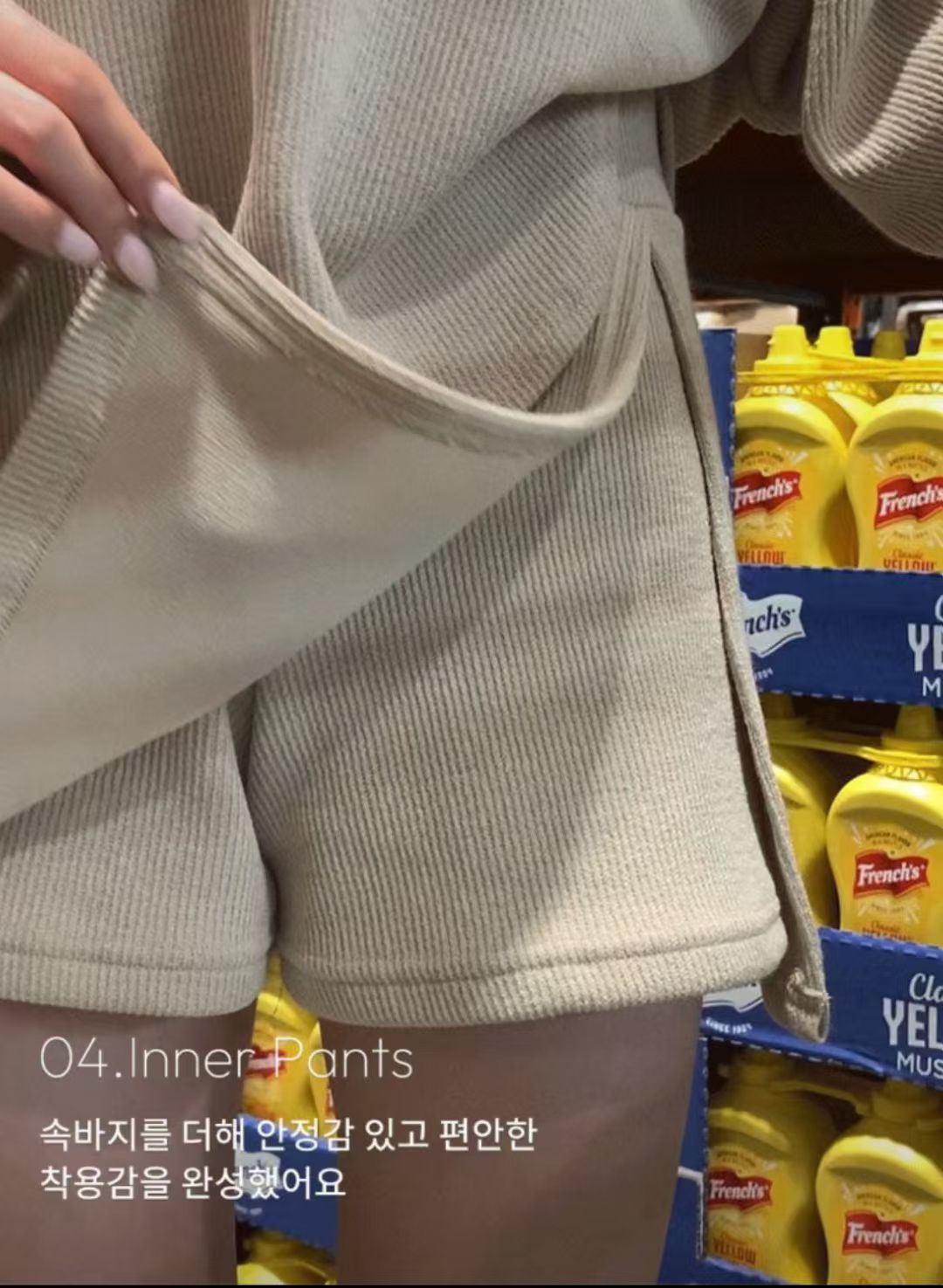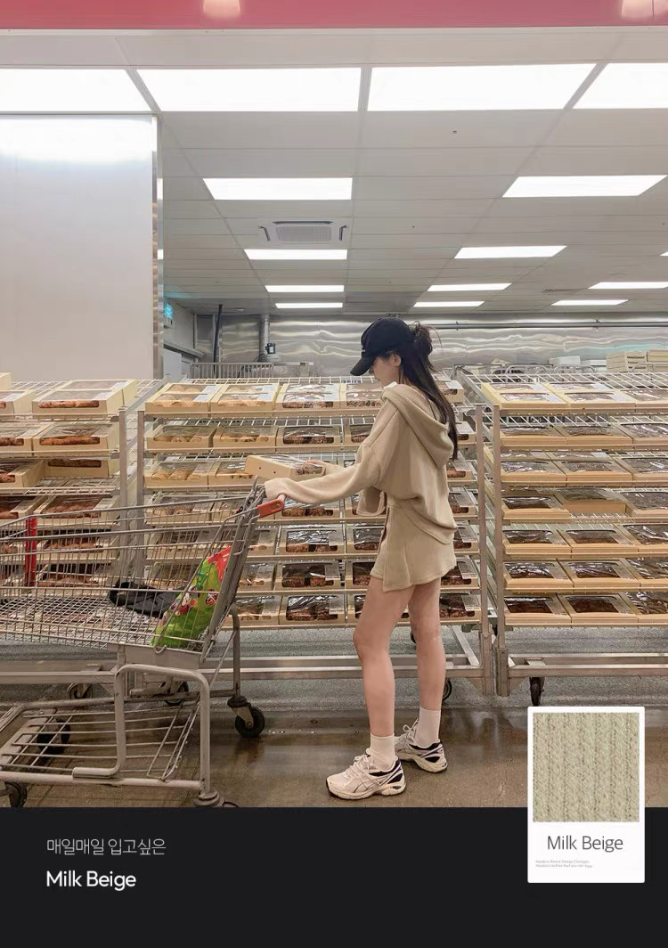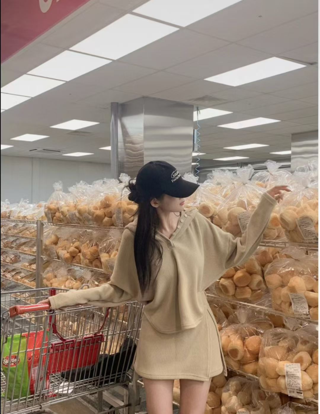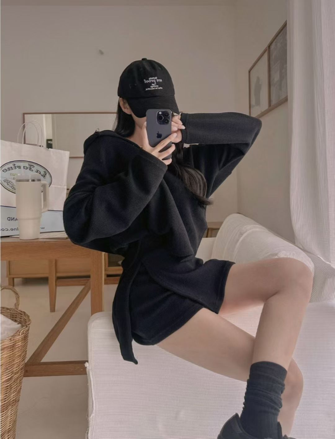 排釦連帽針織衫+鬆緊開衩褲裙SET