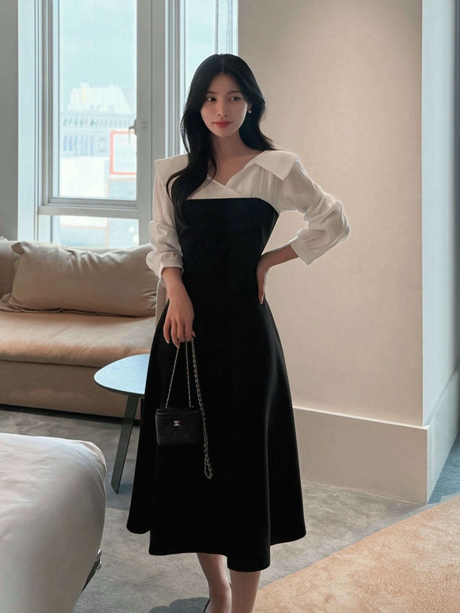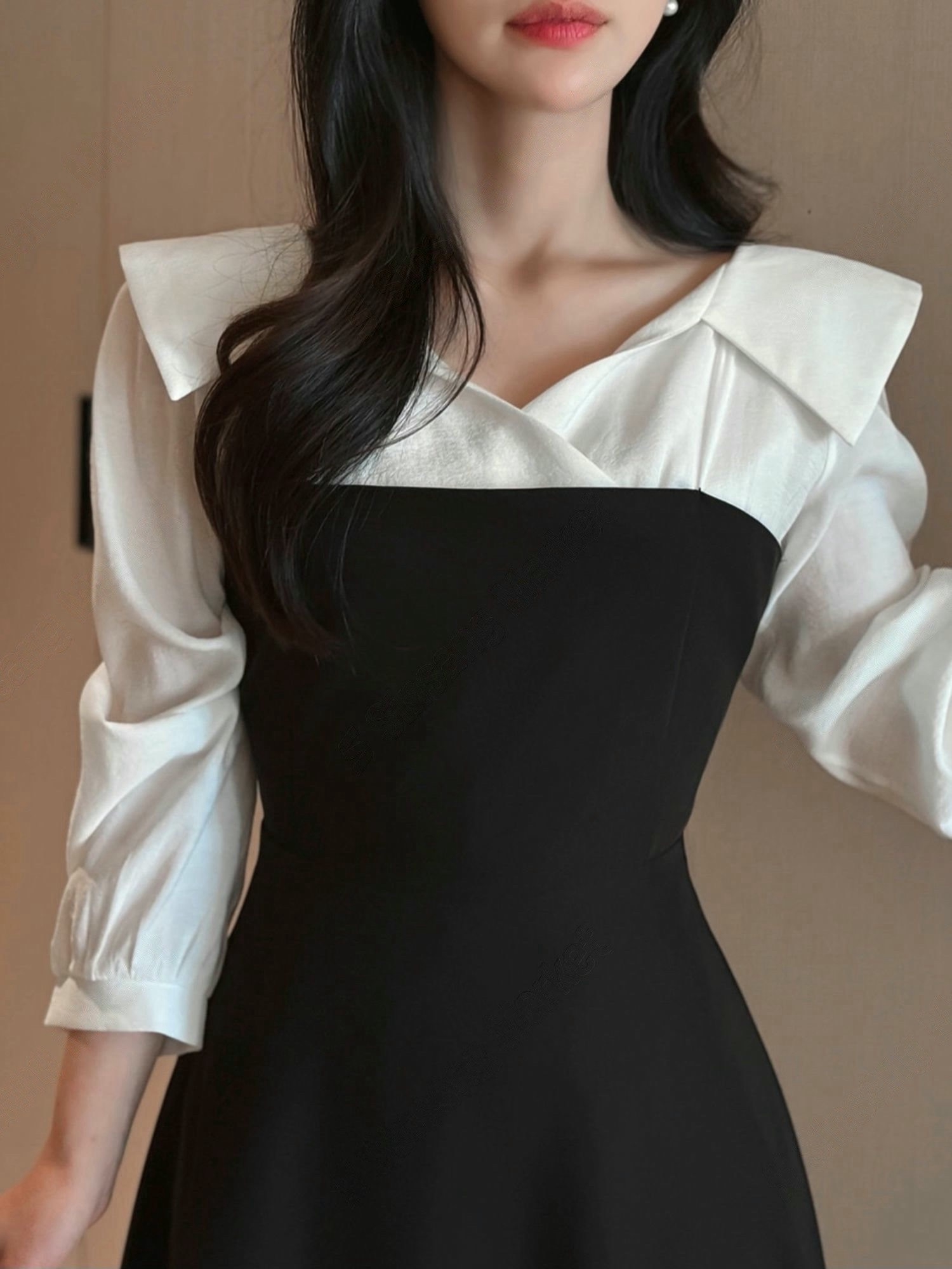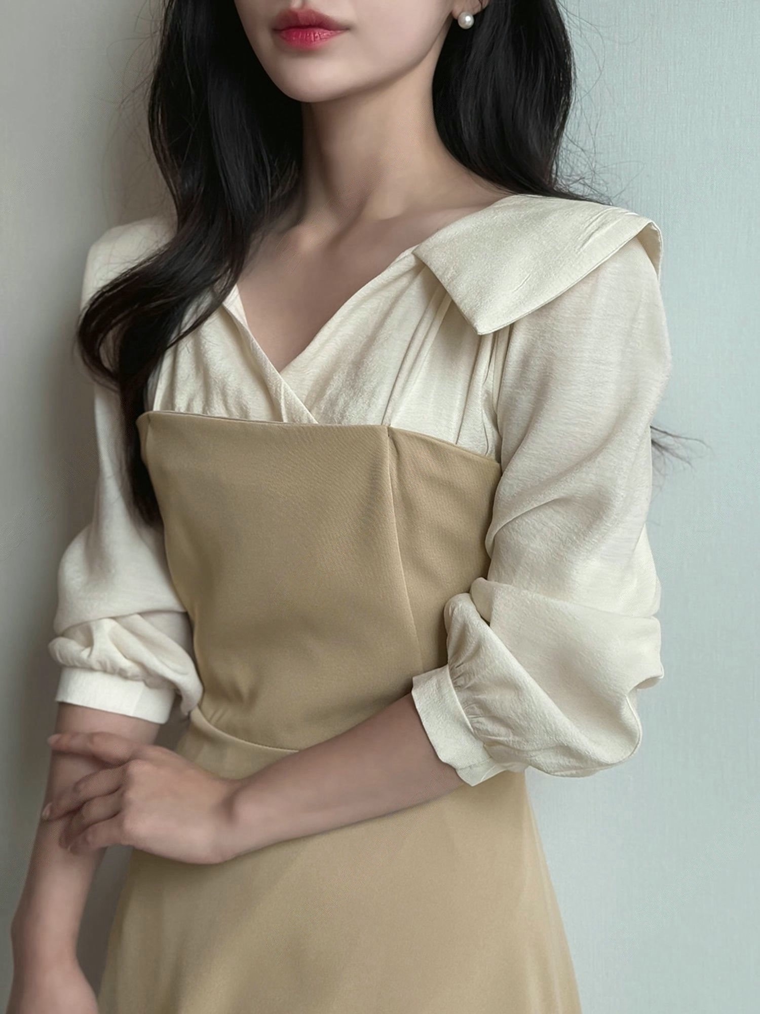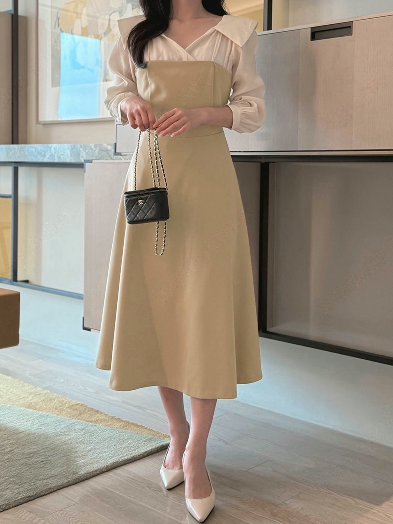 翻領層次拼接傘擺長洋