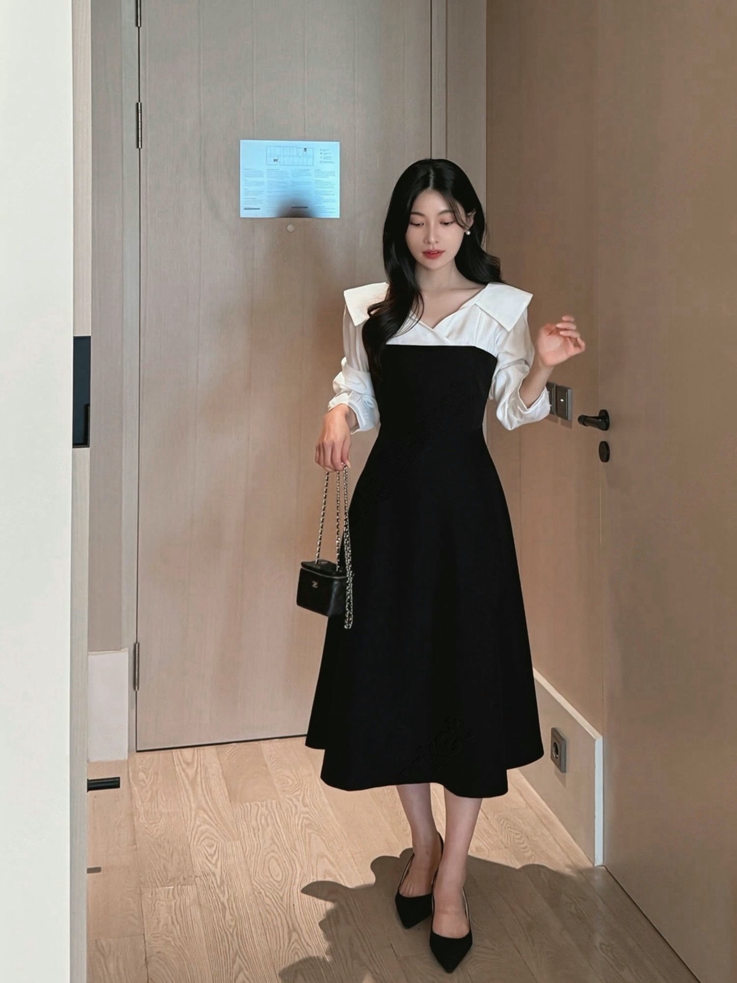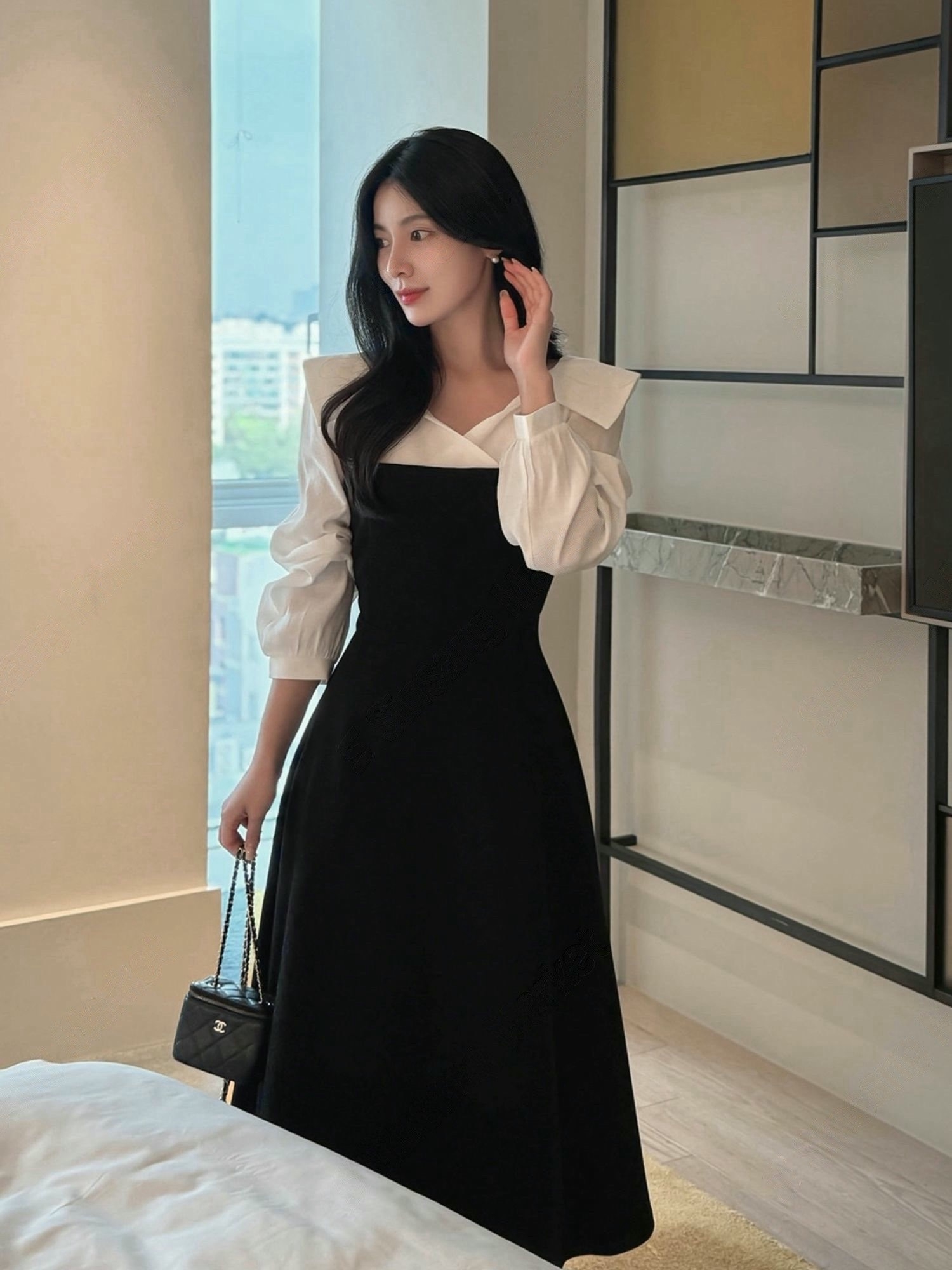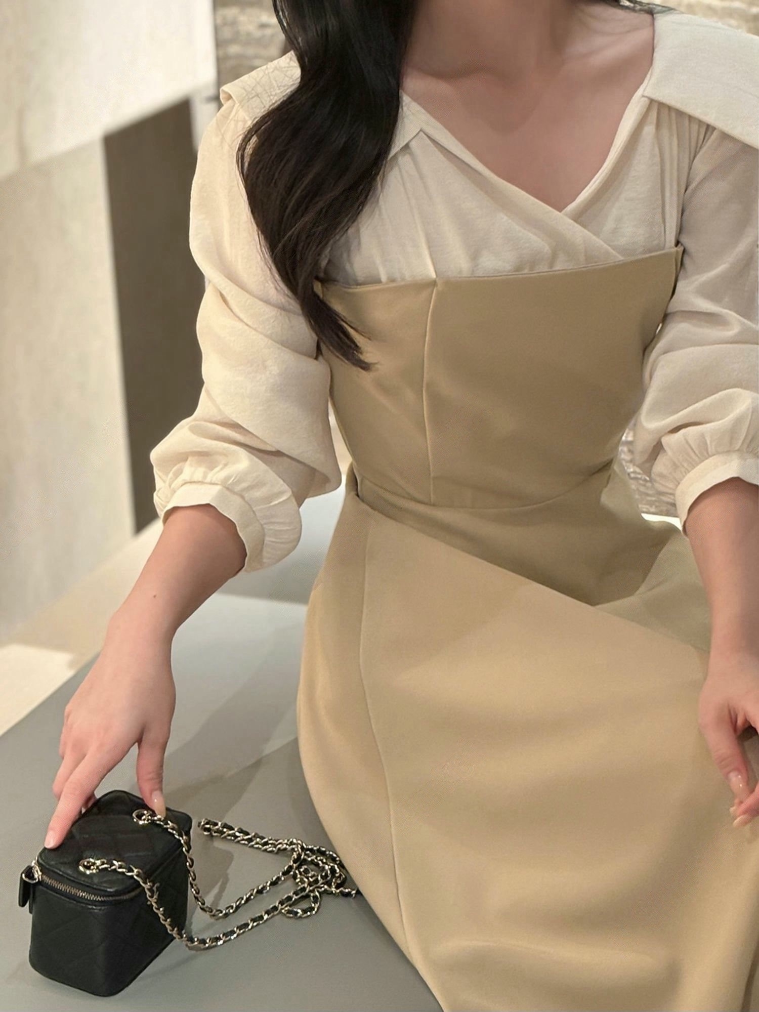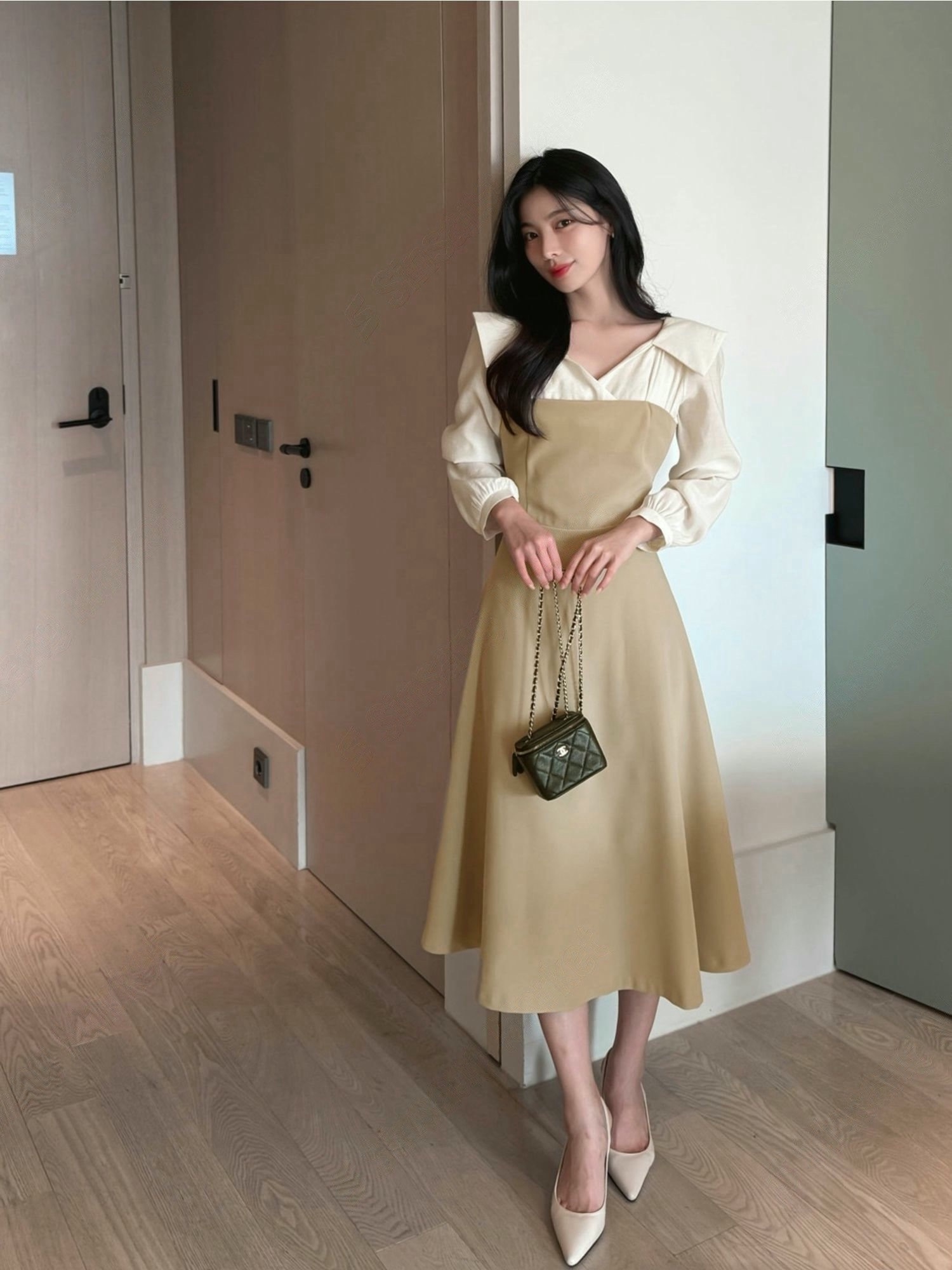 翻領層次拼接傘擺長洋