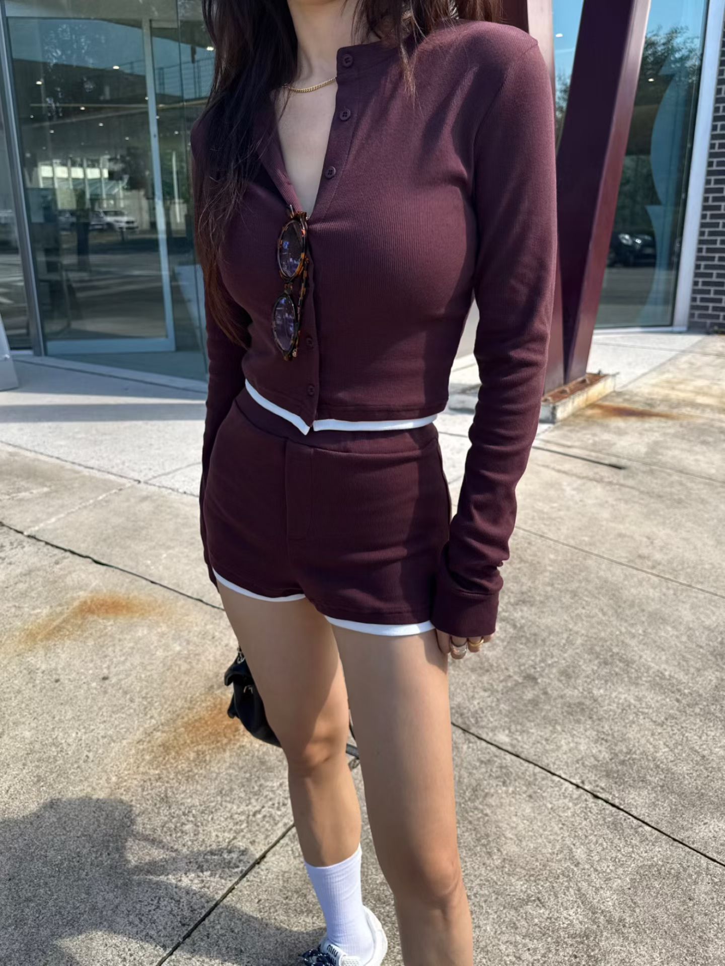 撞色滾邊排釦衫+合身鬆緊短褲SET(可拆買)