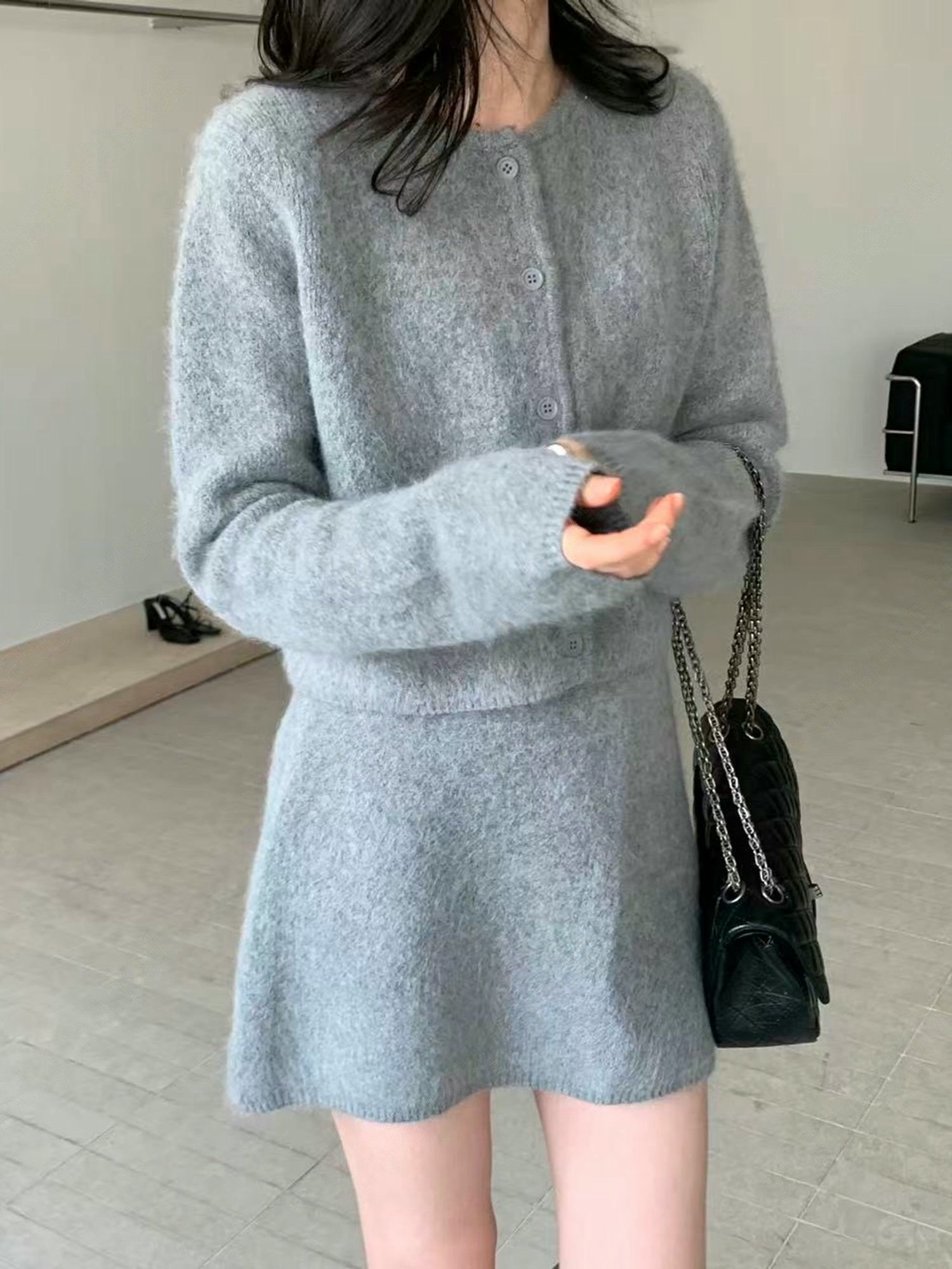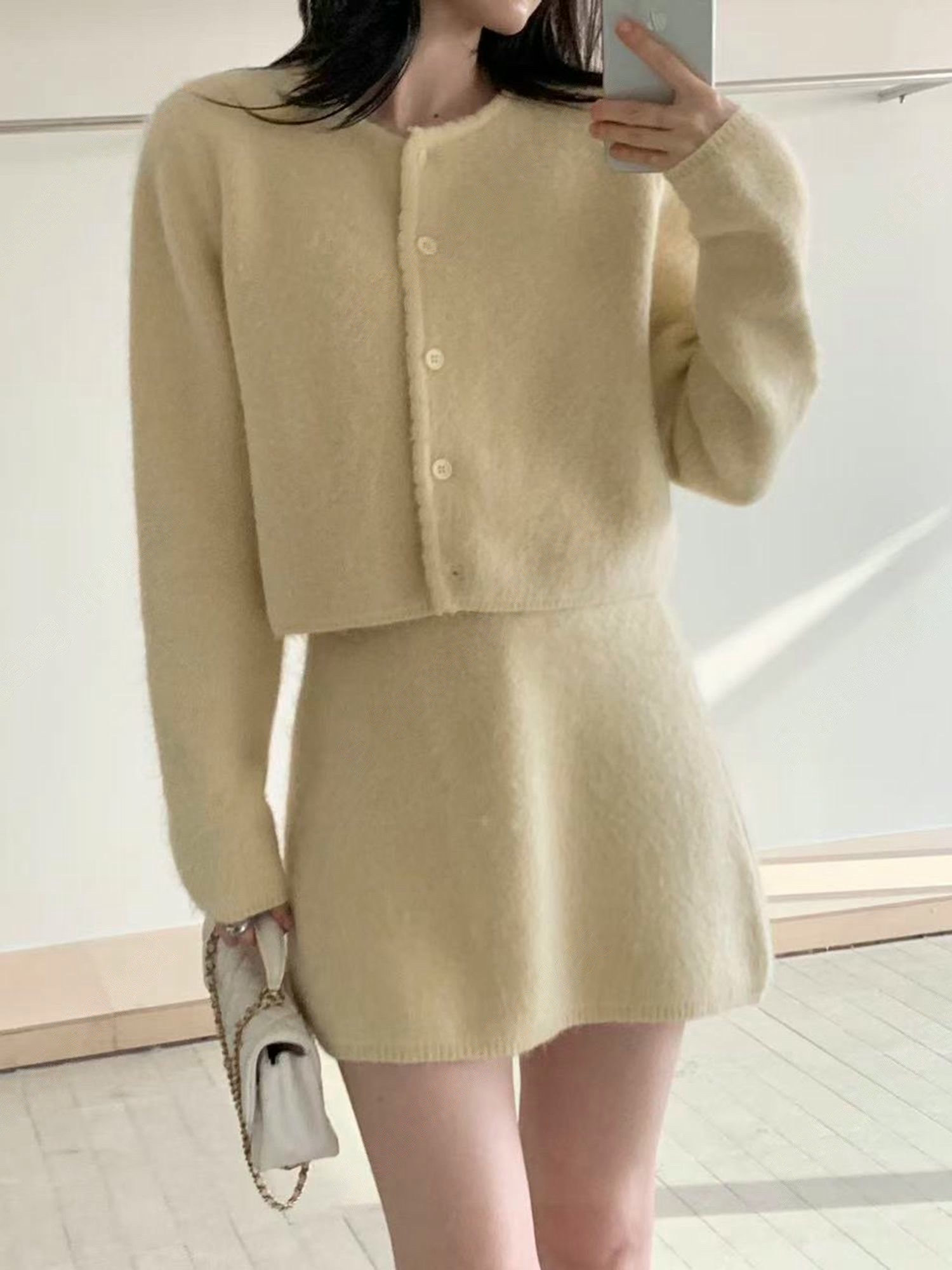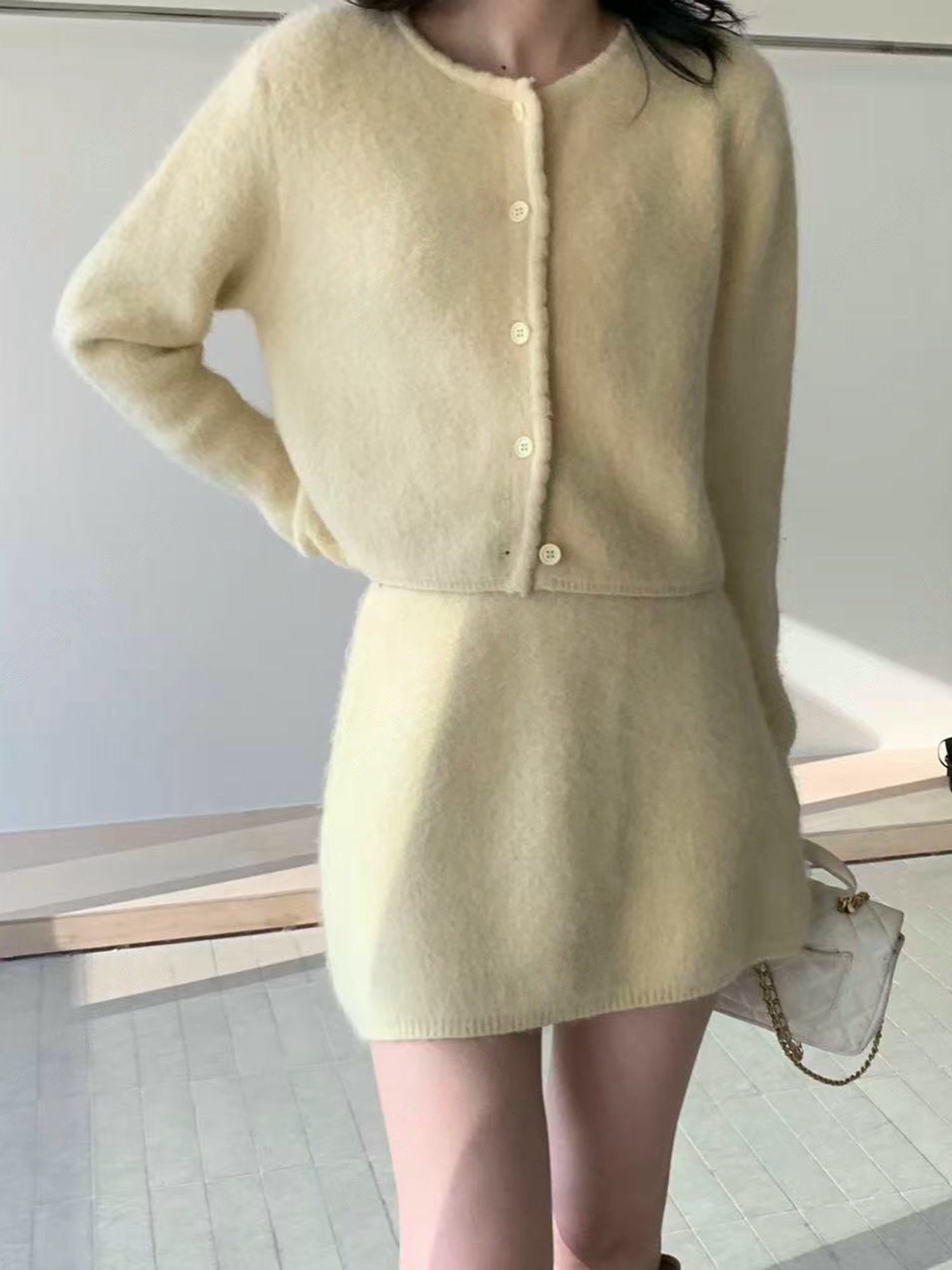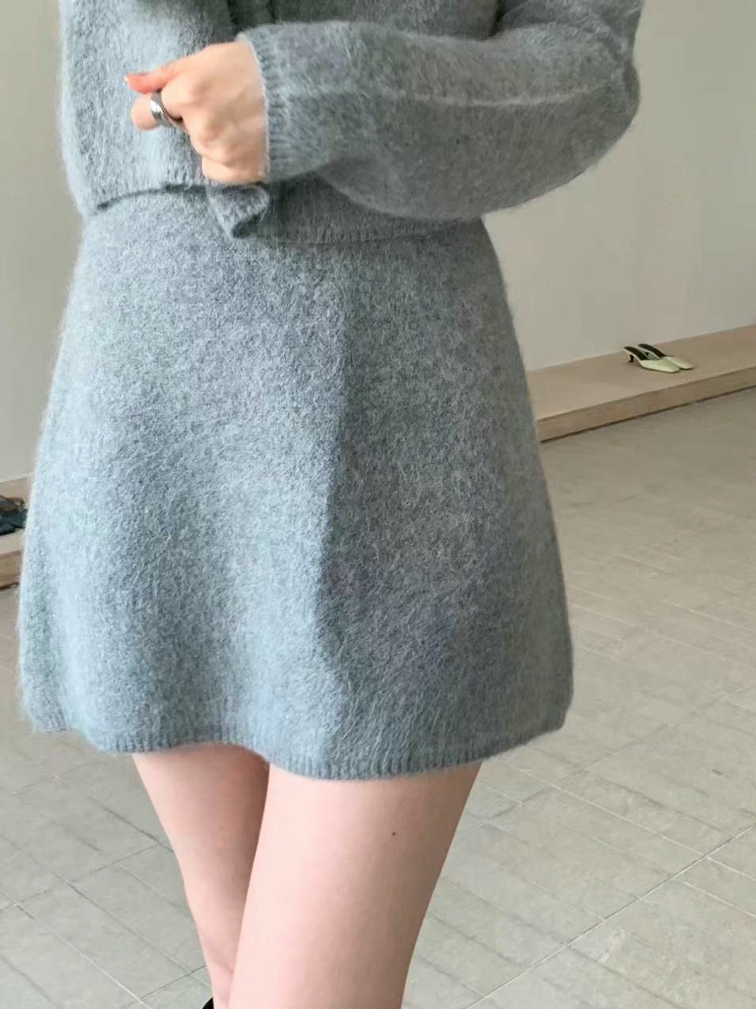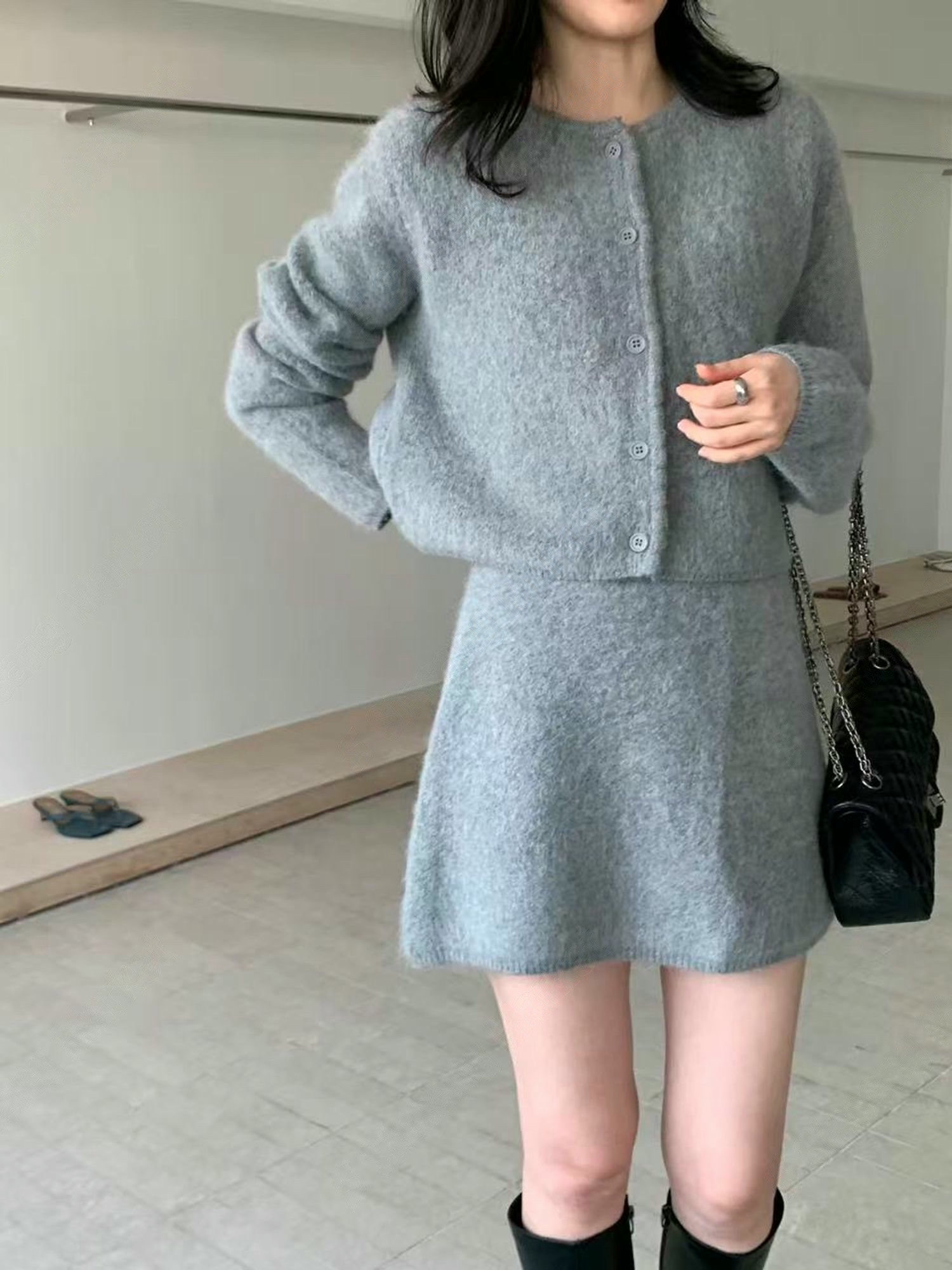 短毛圓領排釦針織衫+鬆緊A字短裙SET