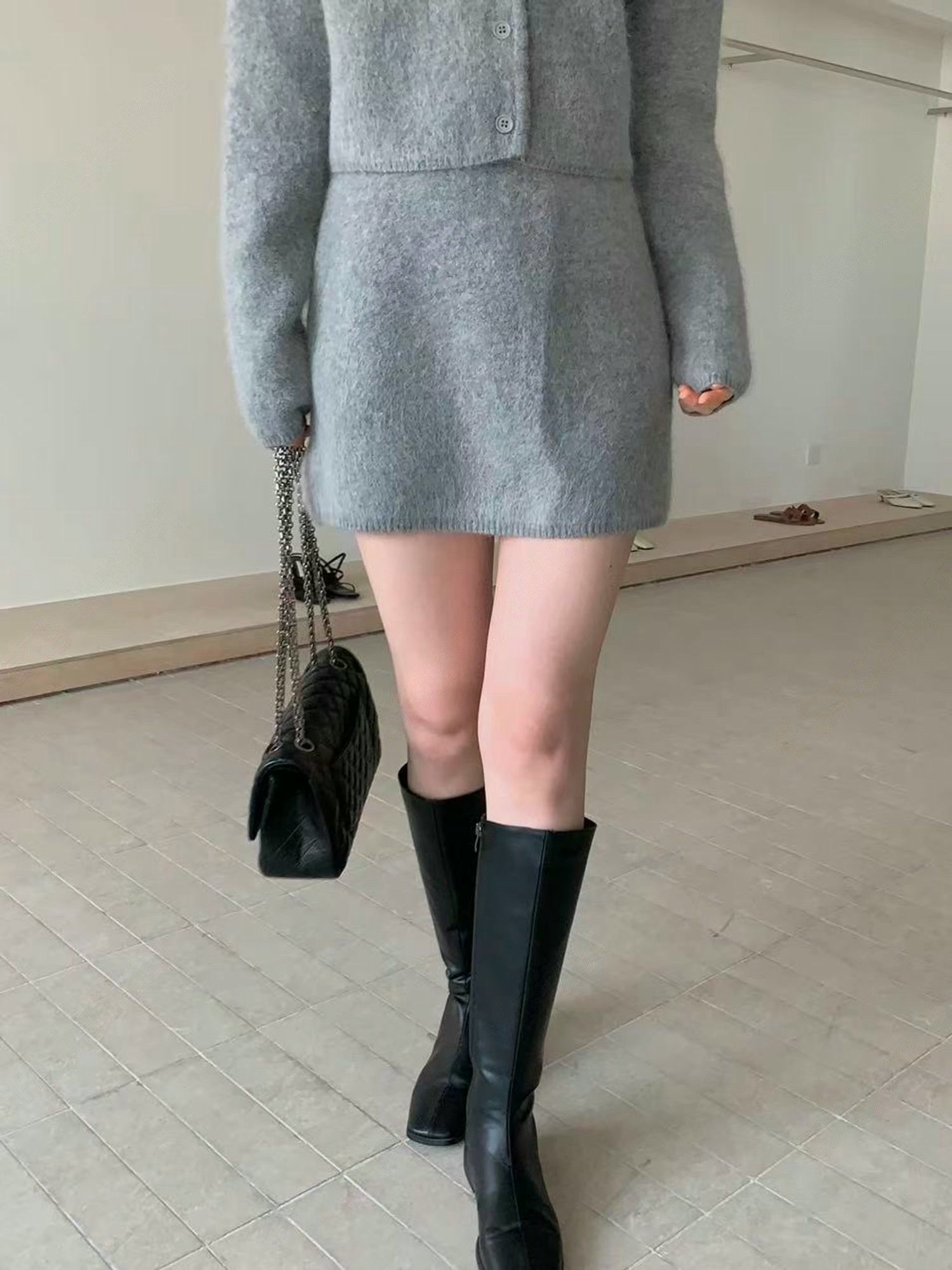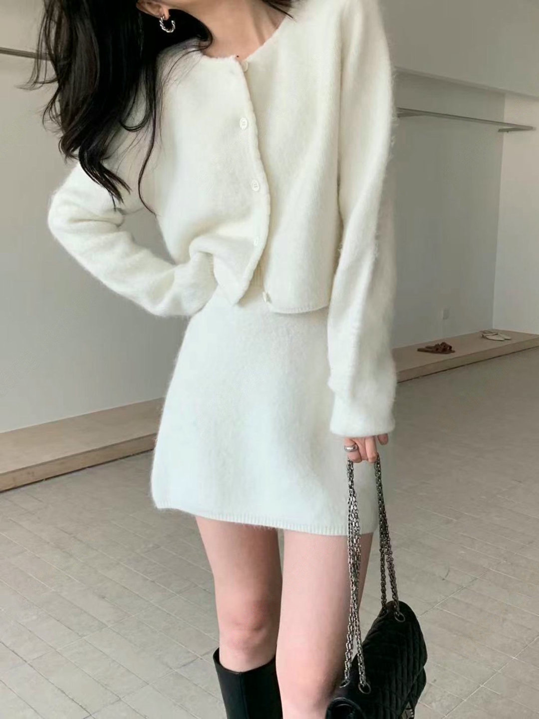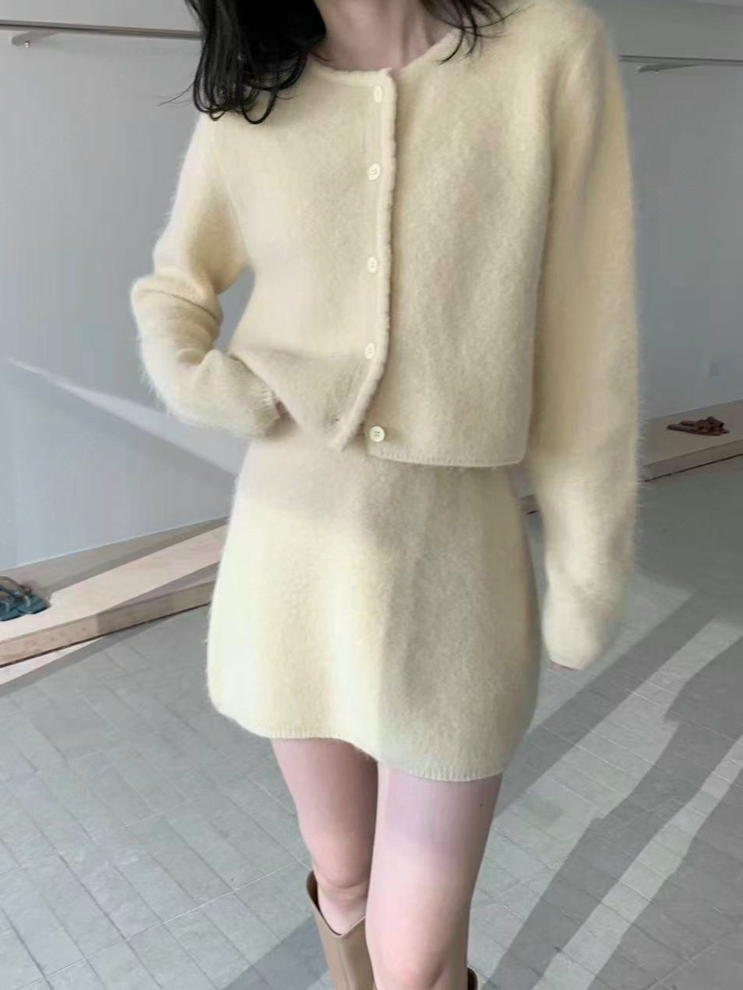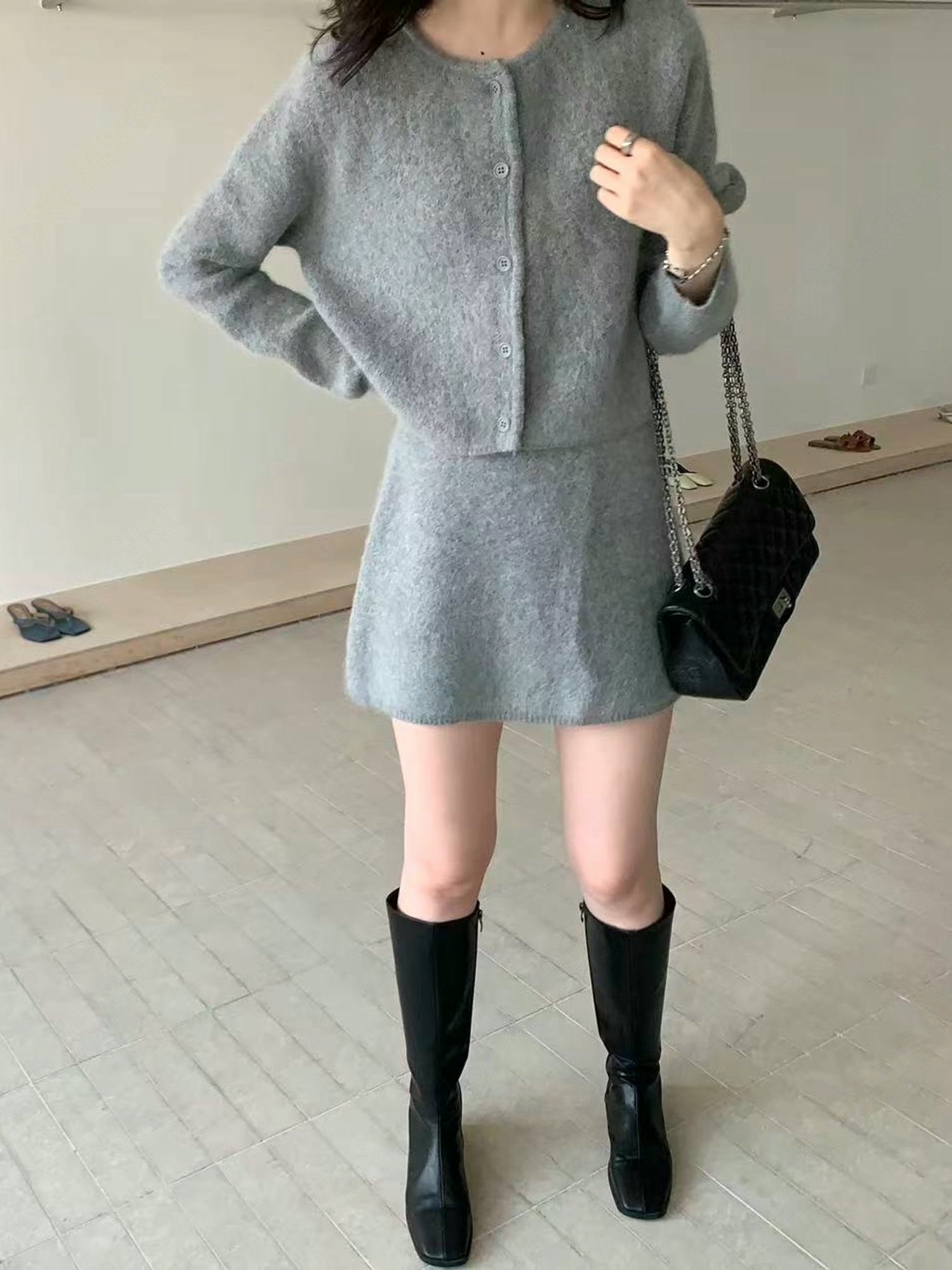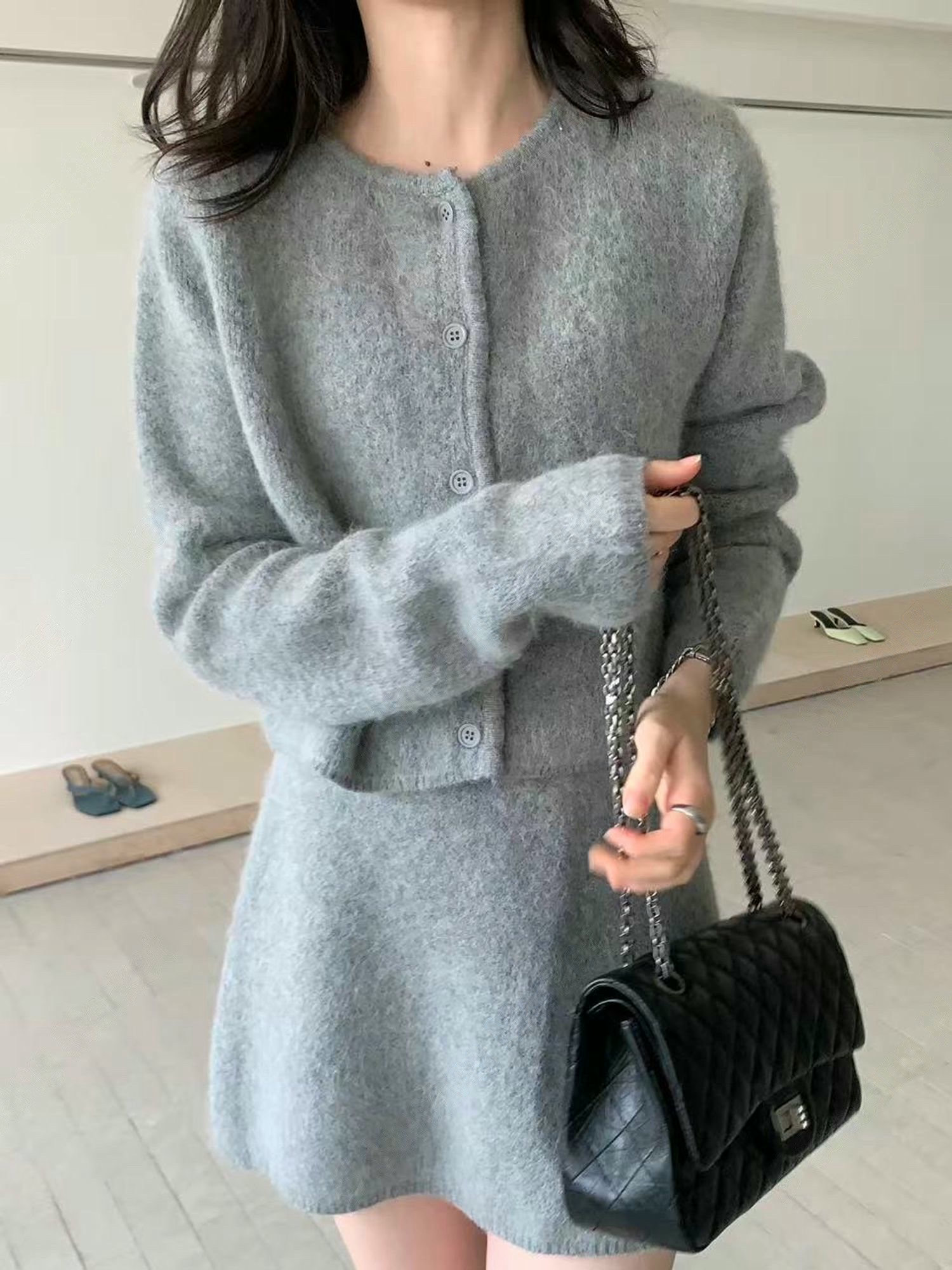 短毛圓領排釦針織衫+鬆緊A字短裙SET