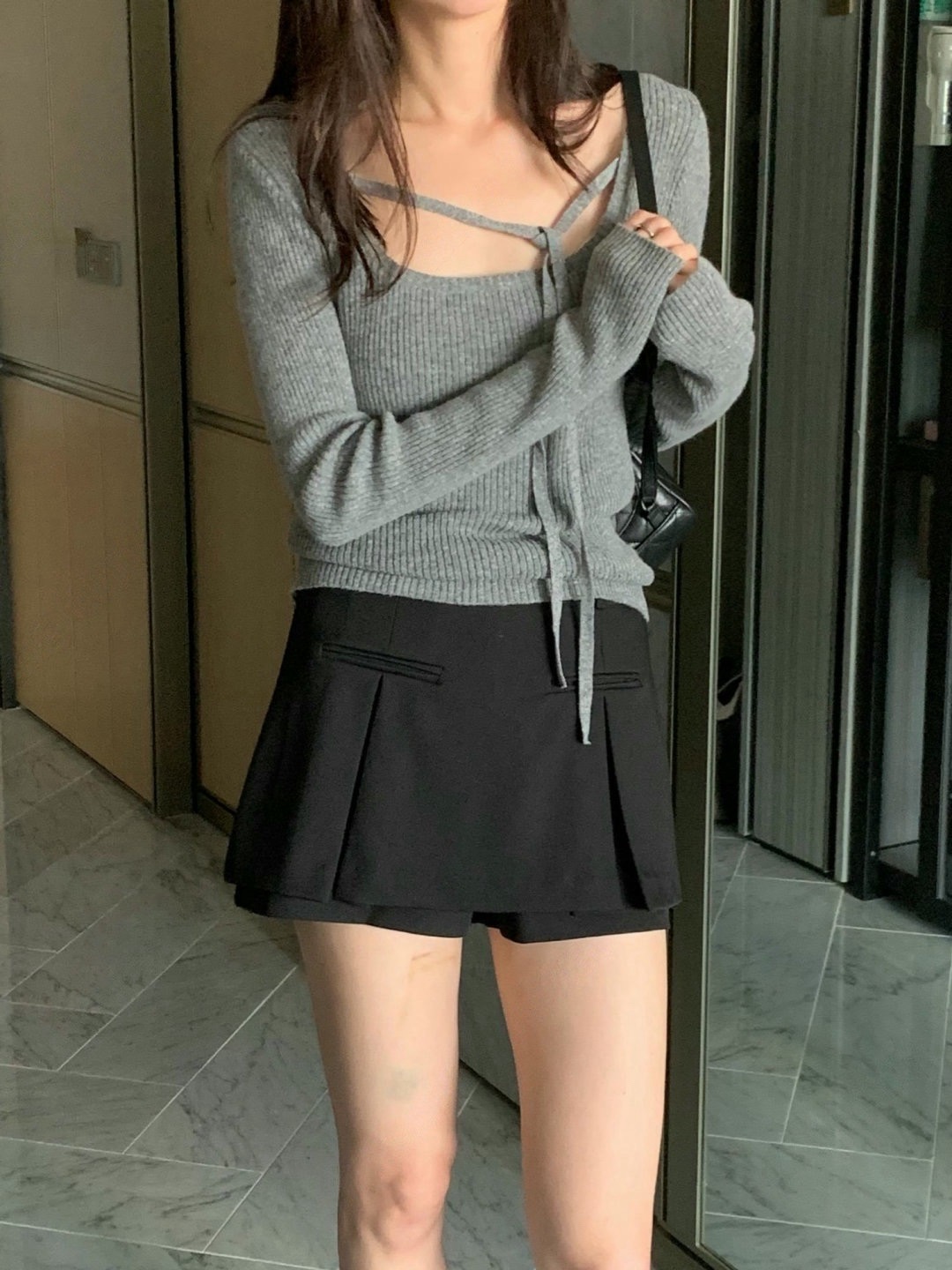 三件組|菱格紋背心+傘擺短裙+排釦罩衫SET