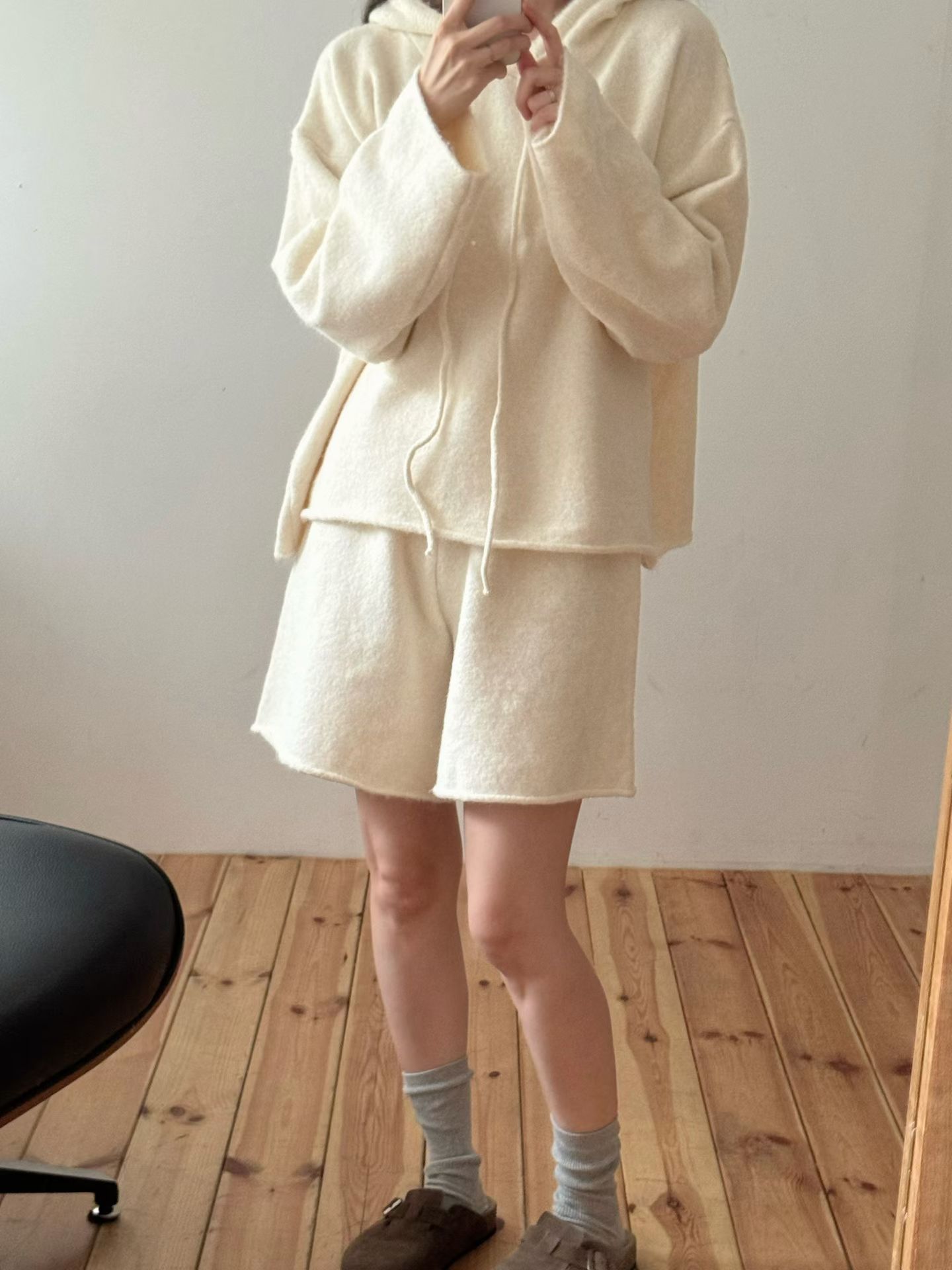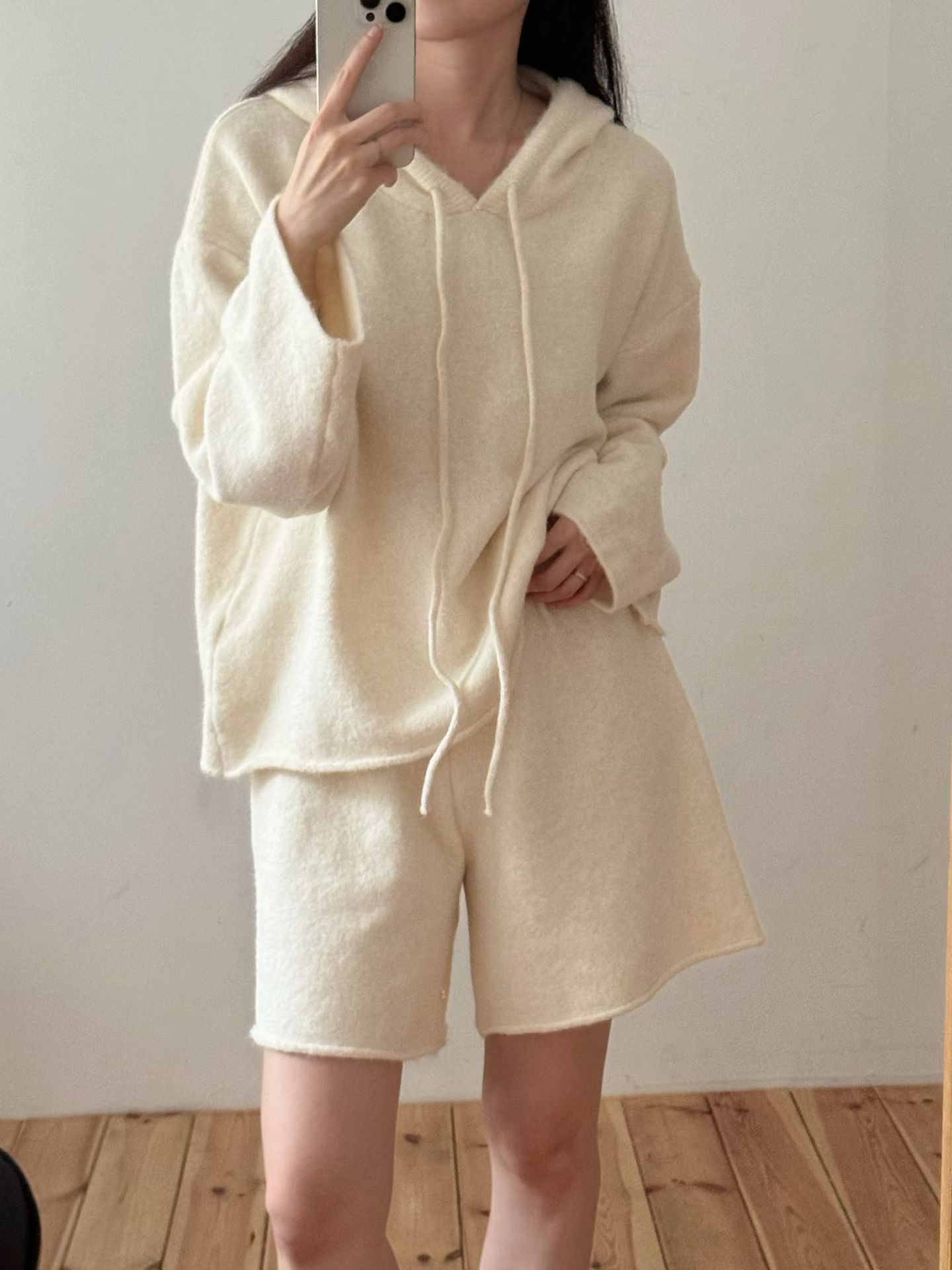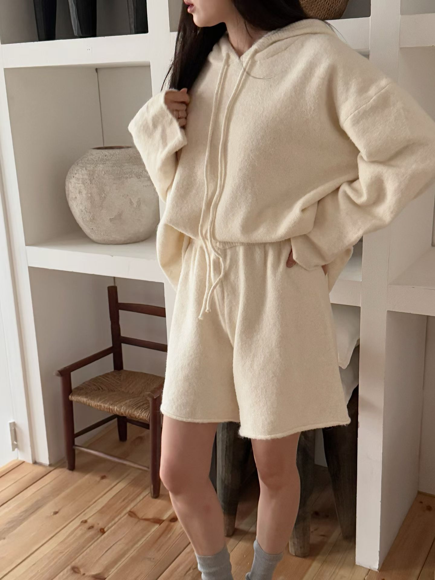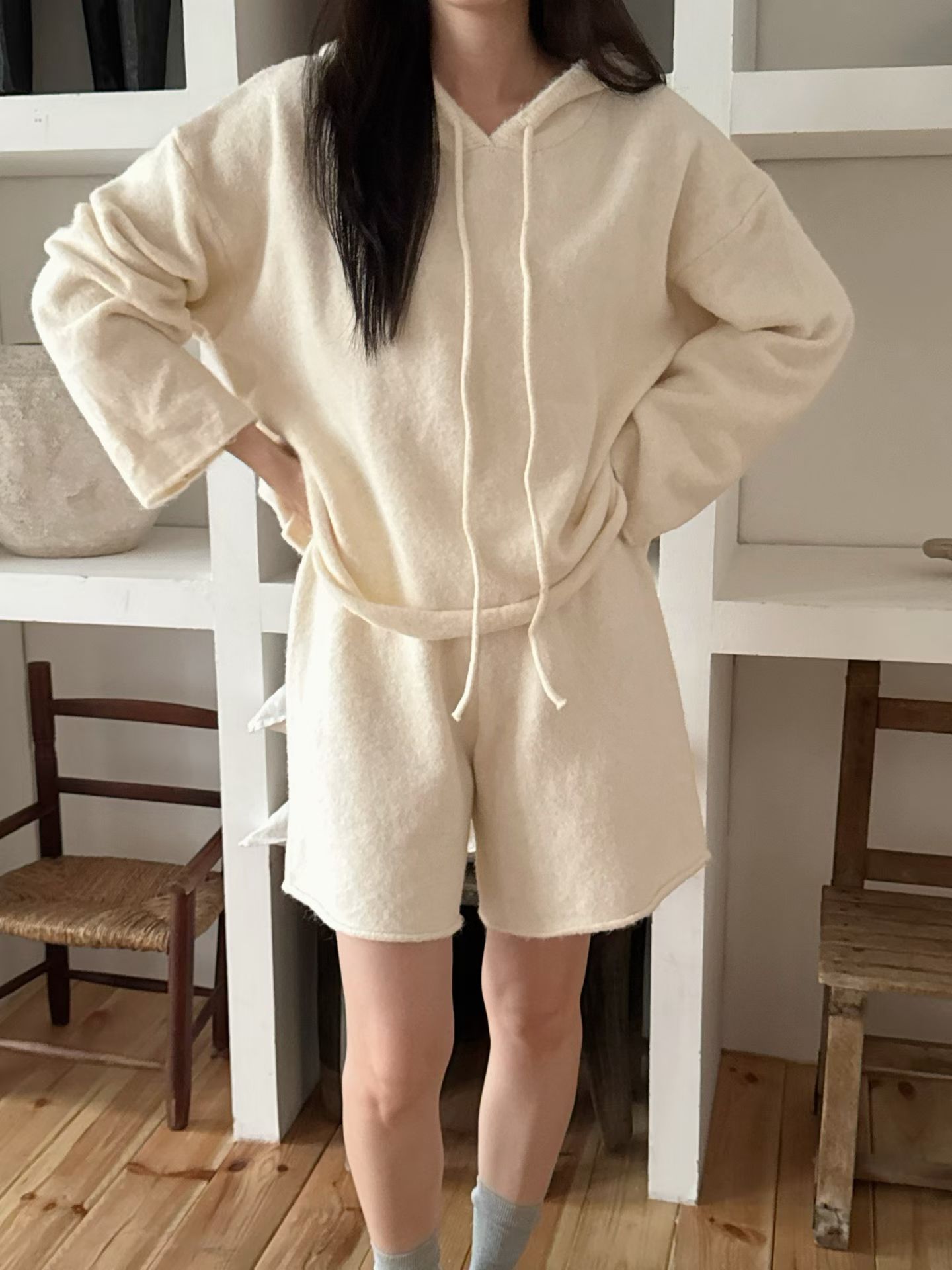 抽繩連帽針織衫+鬆緊三分針織褲SET