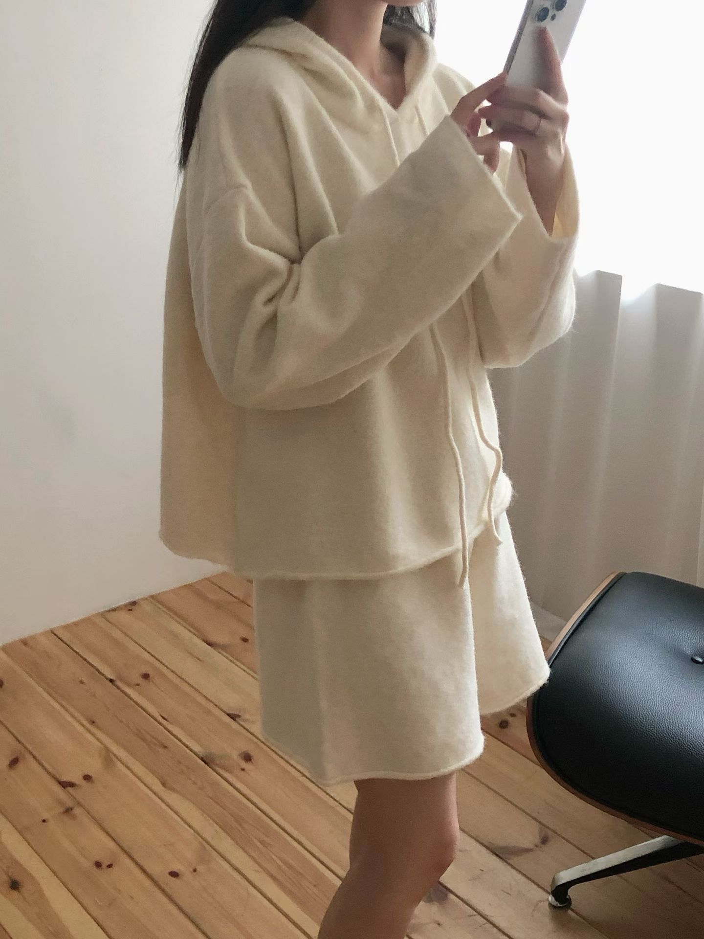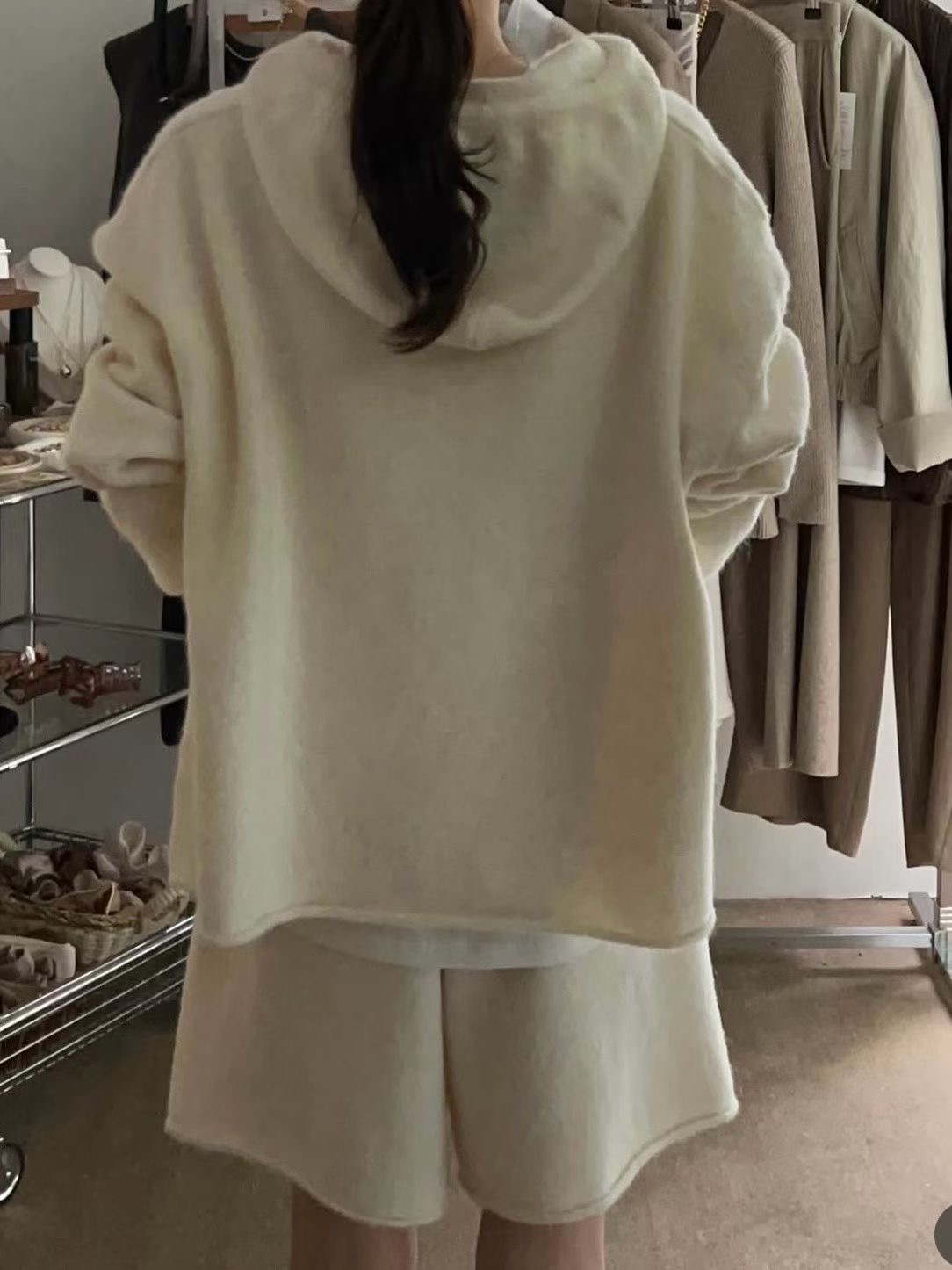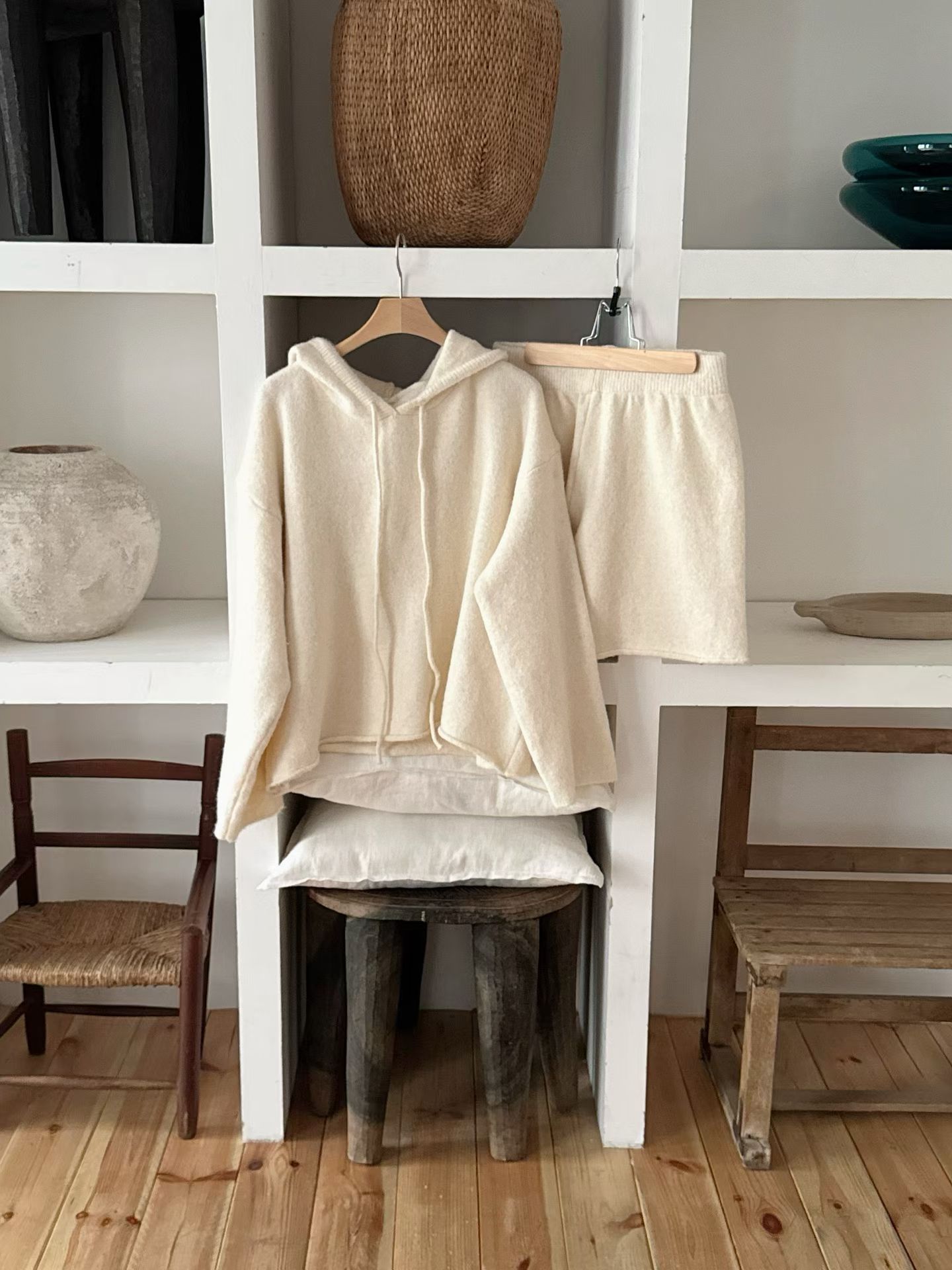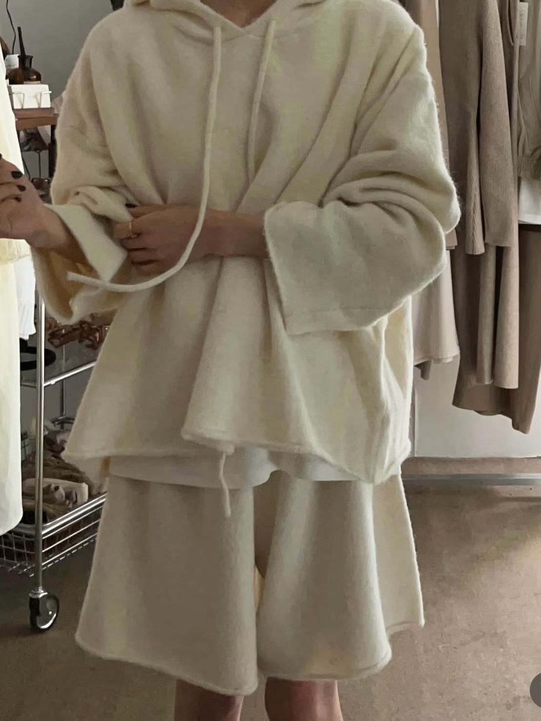抽繩連帽針織衫+鬆緊三分針織褲SET