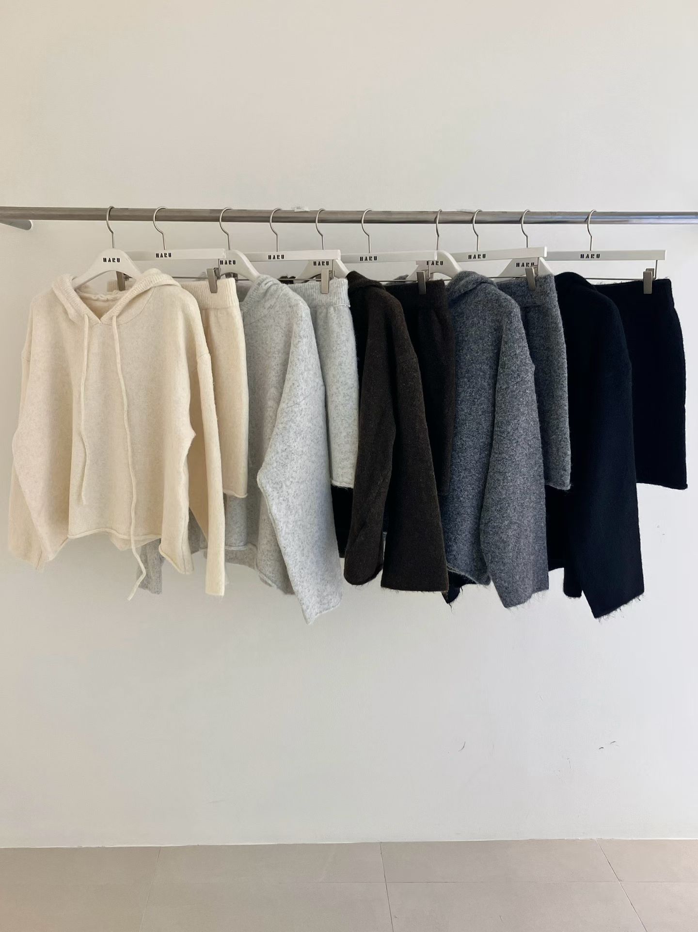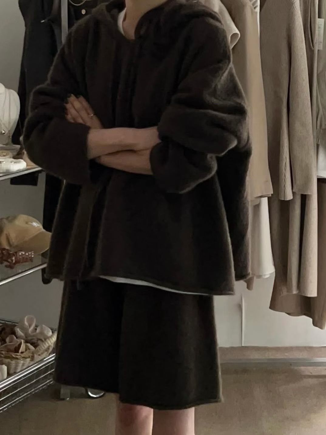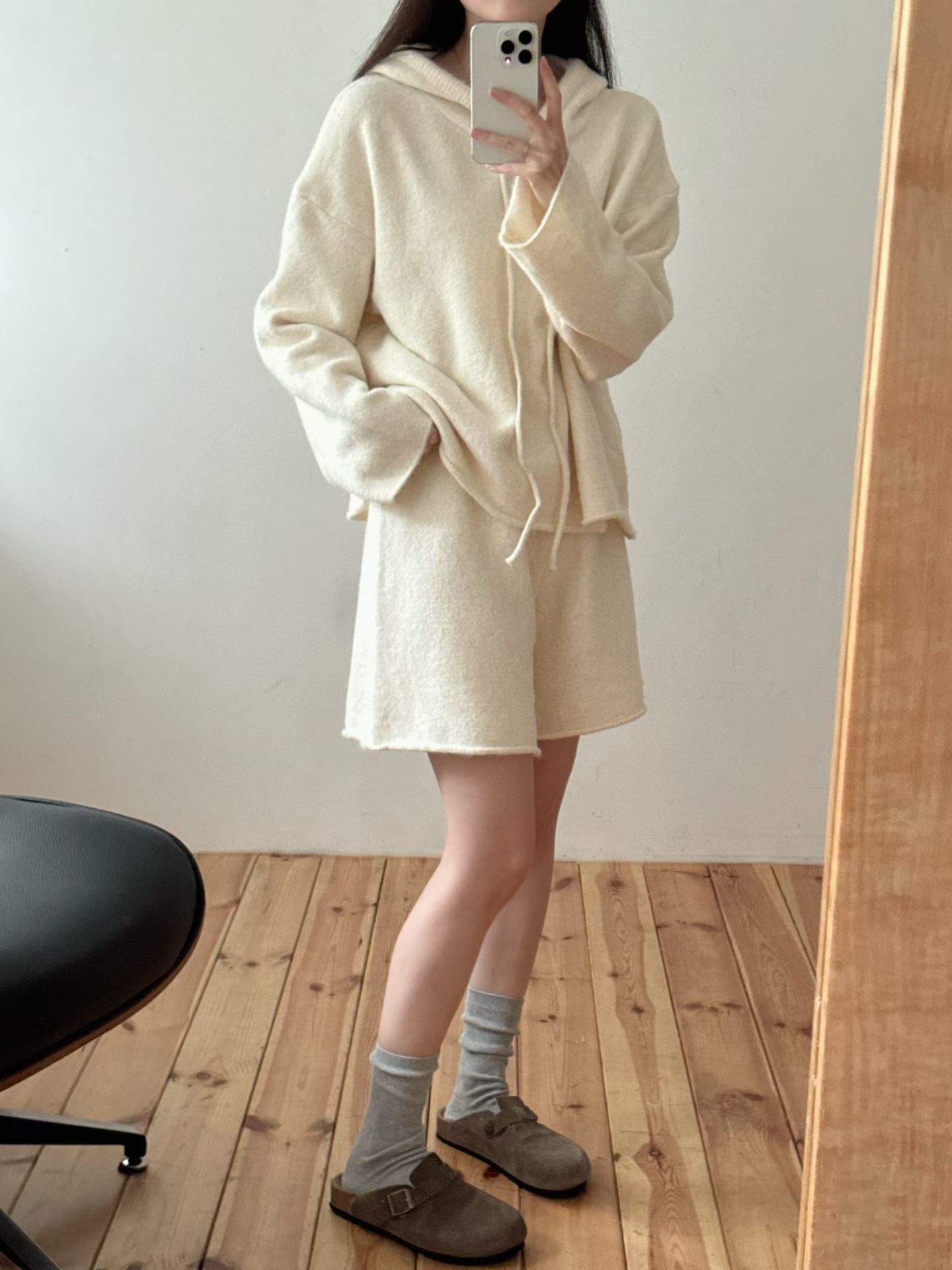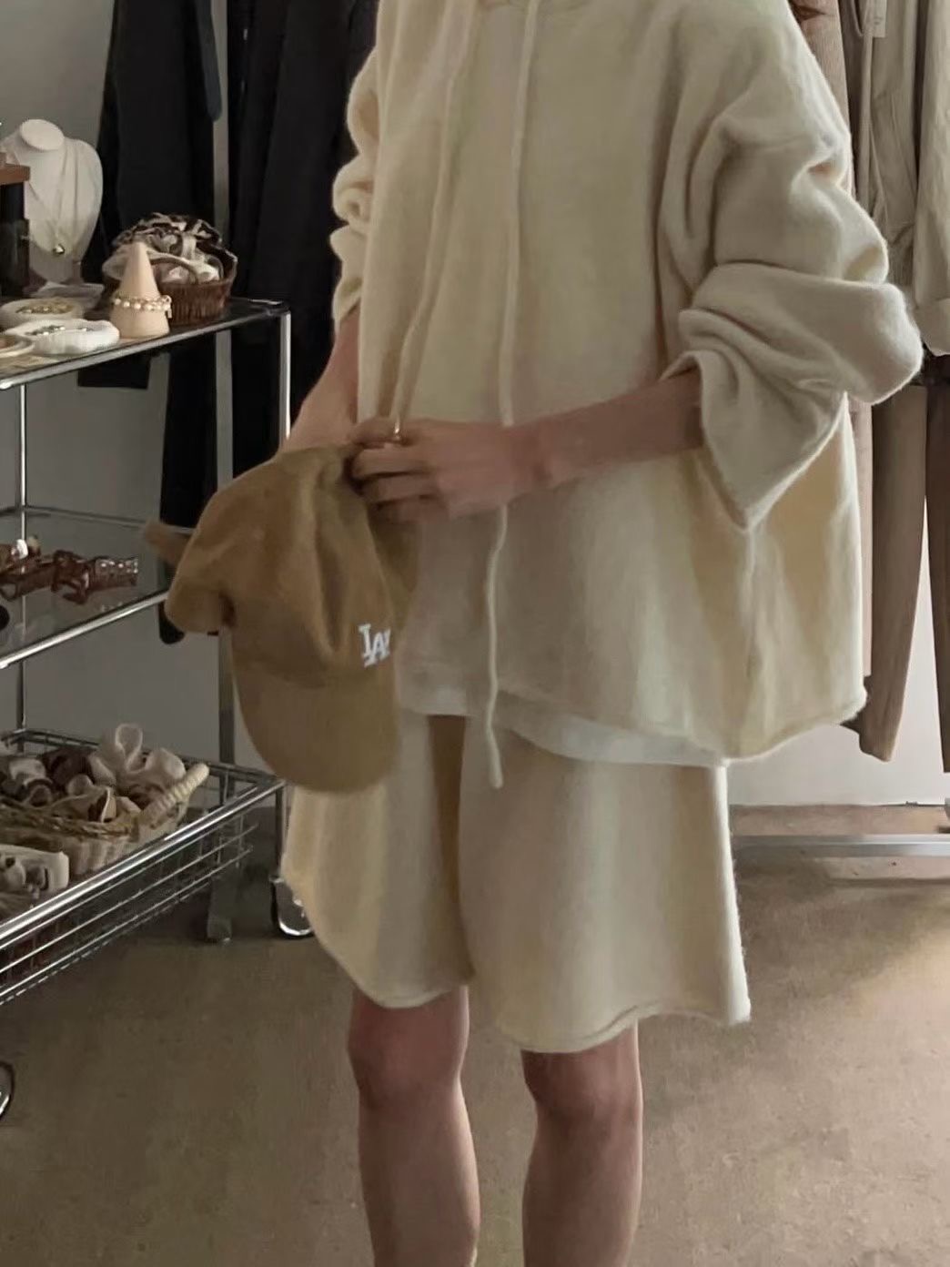 抽繩連帽針織衫+鬆緊三分針織褲SET