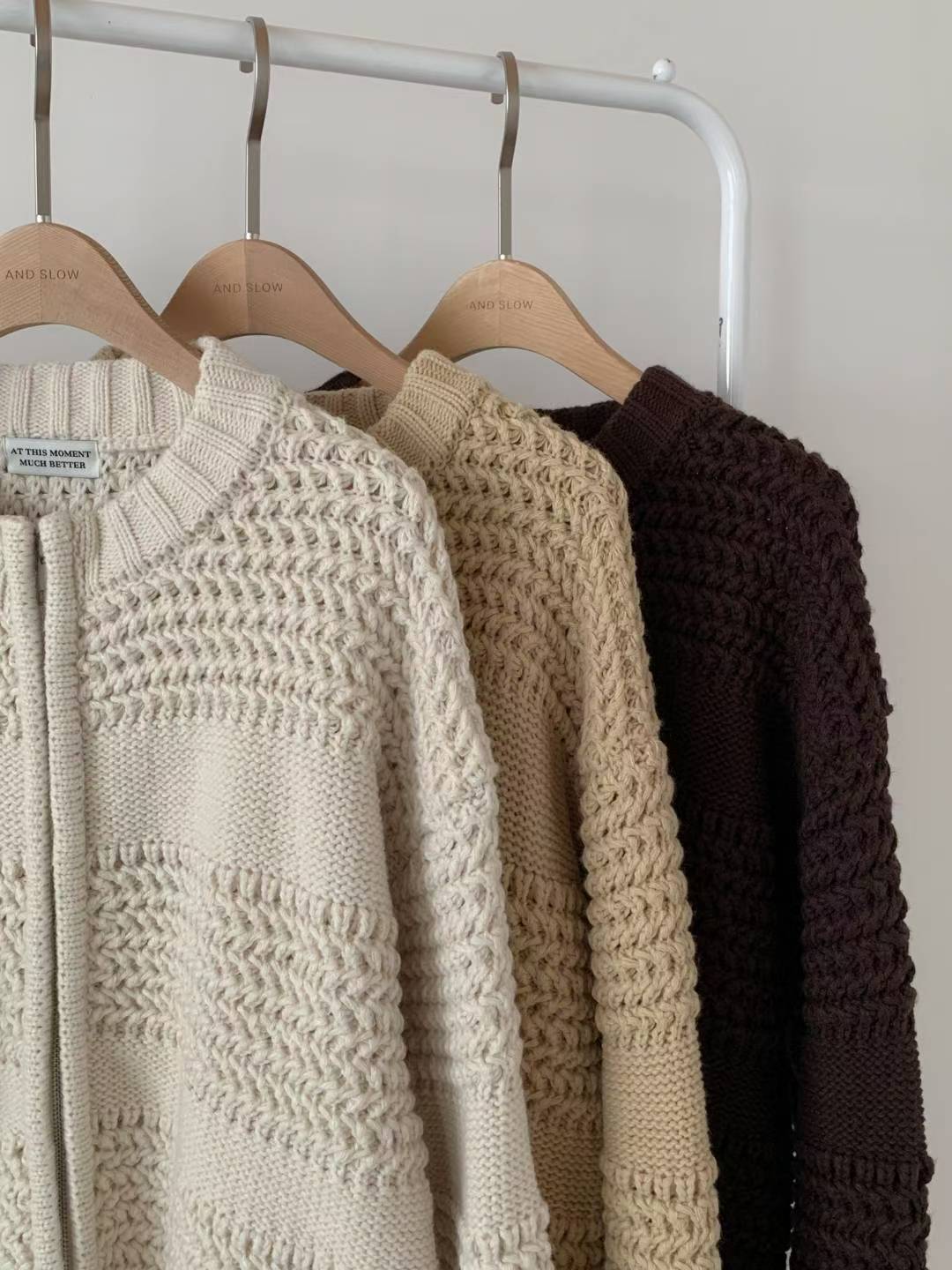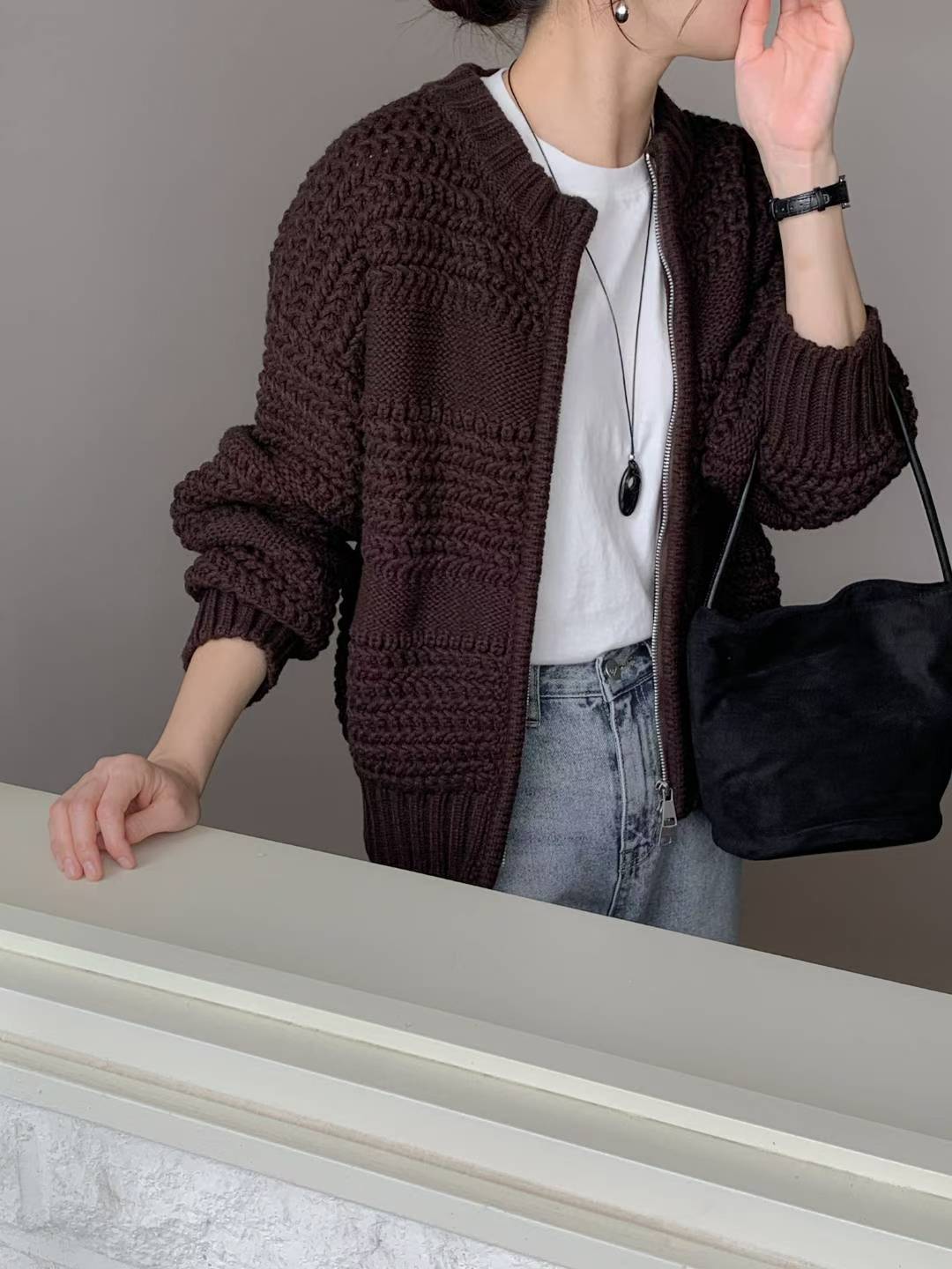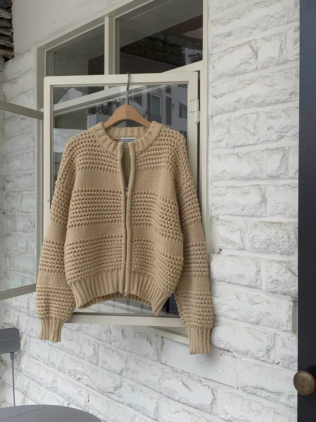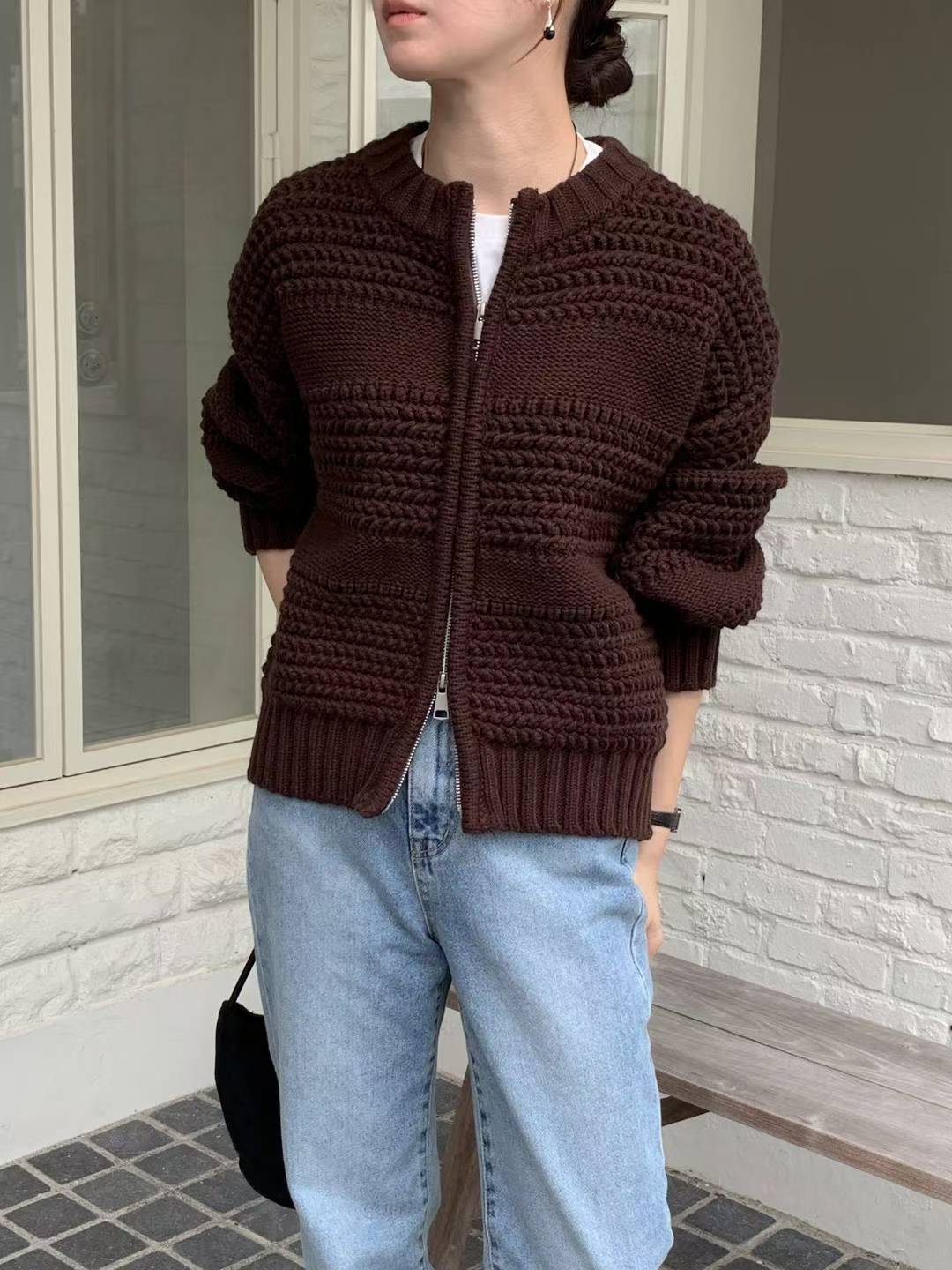 圓領磅數編織紋拉鍊針織外套