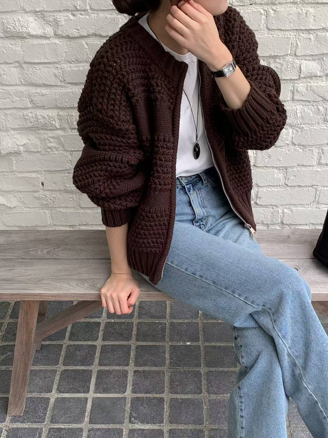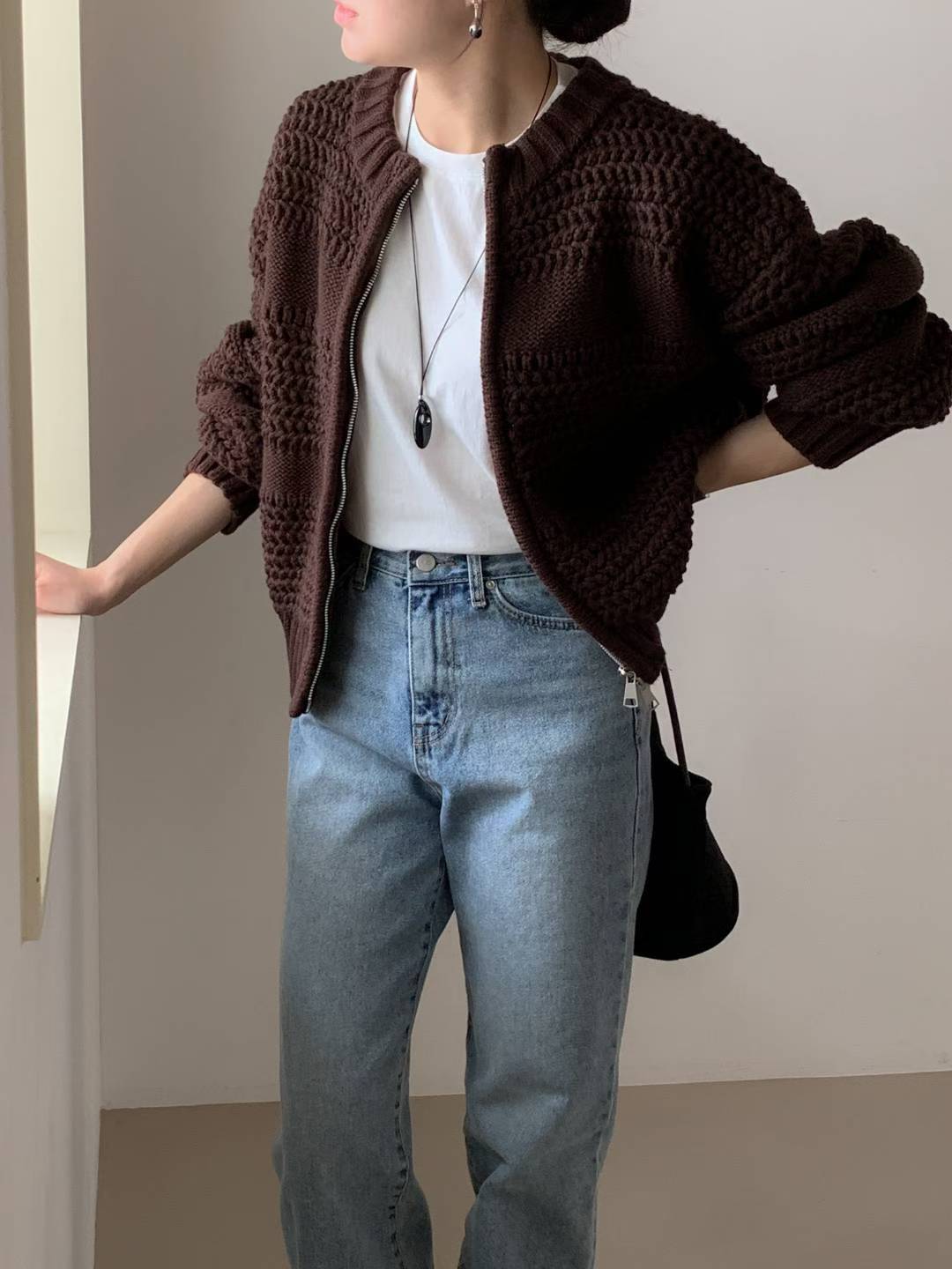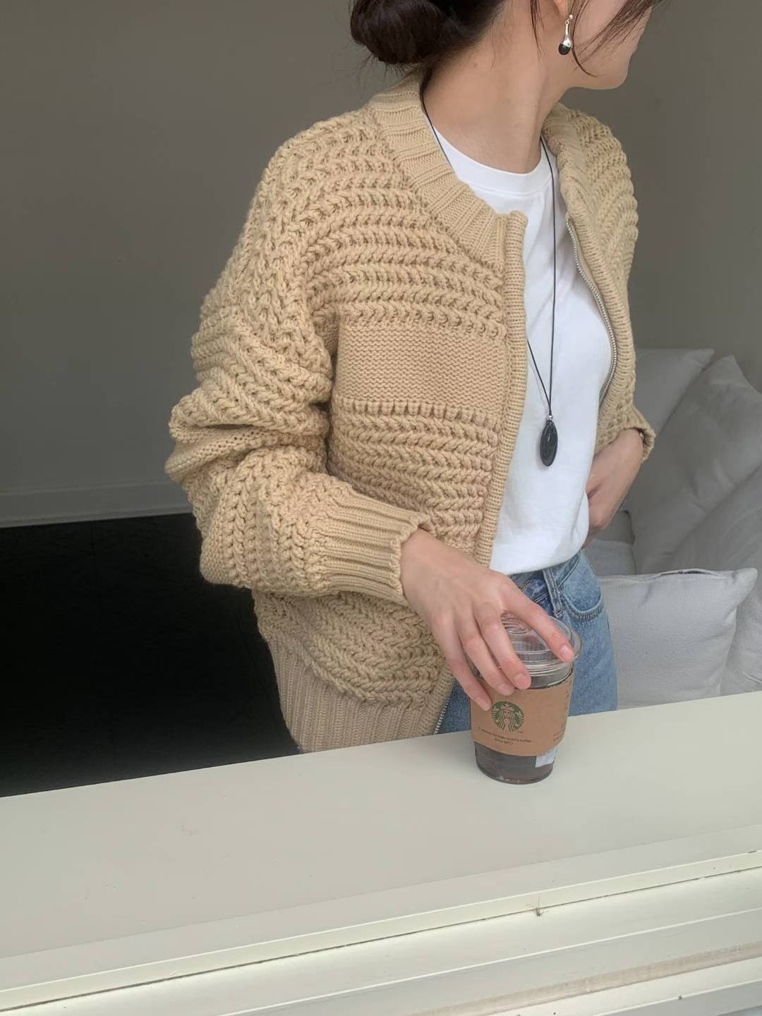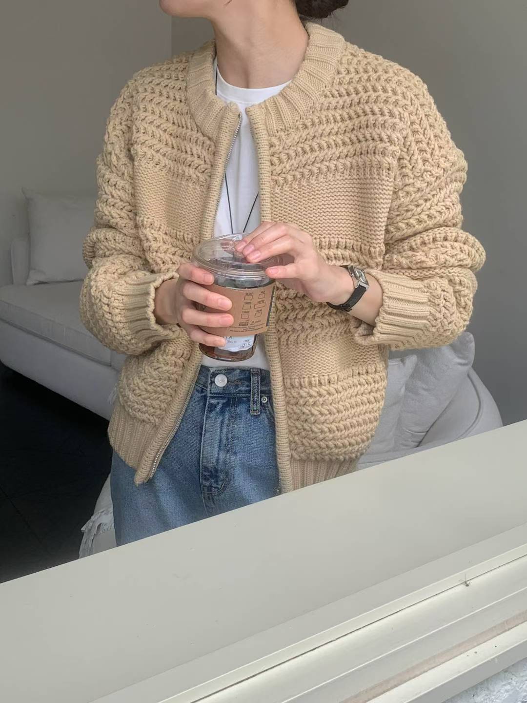 圓領磅數編織紋拉鍊針織外套