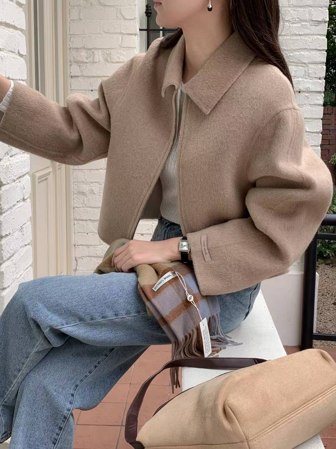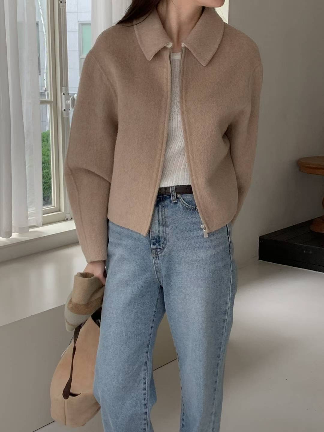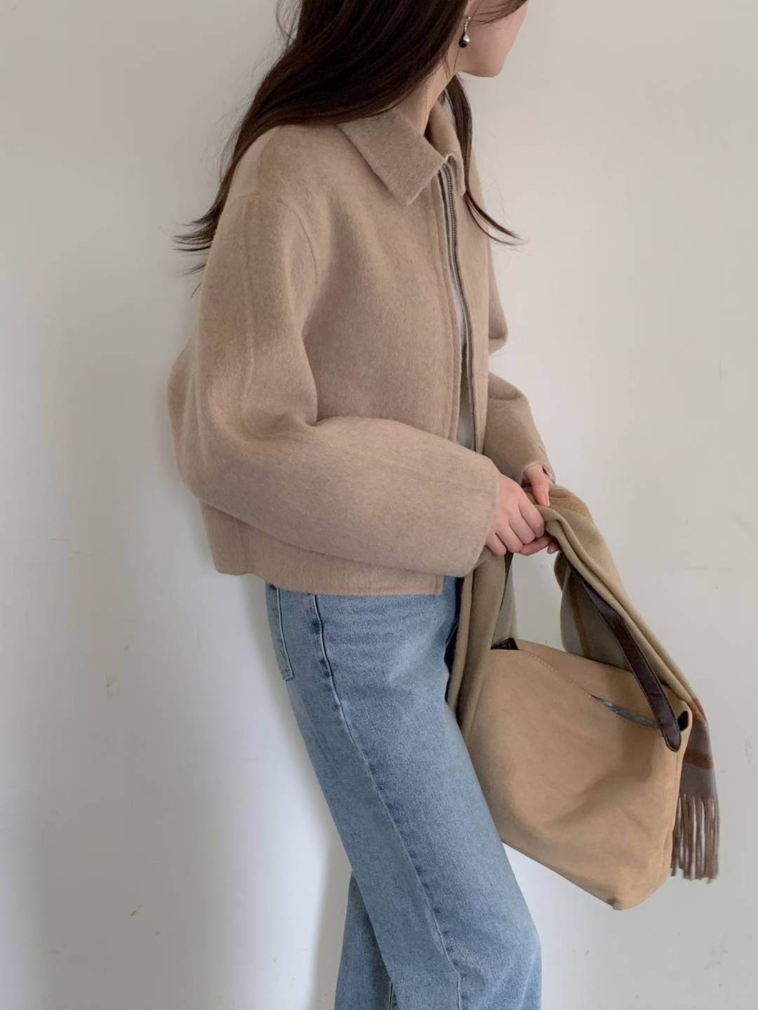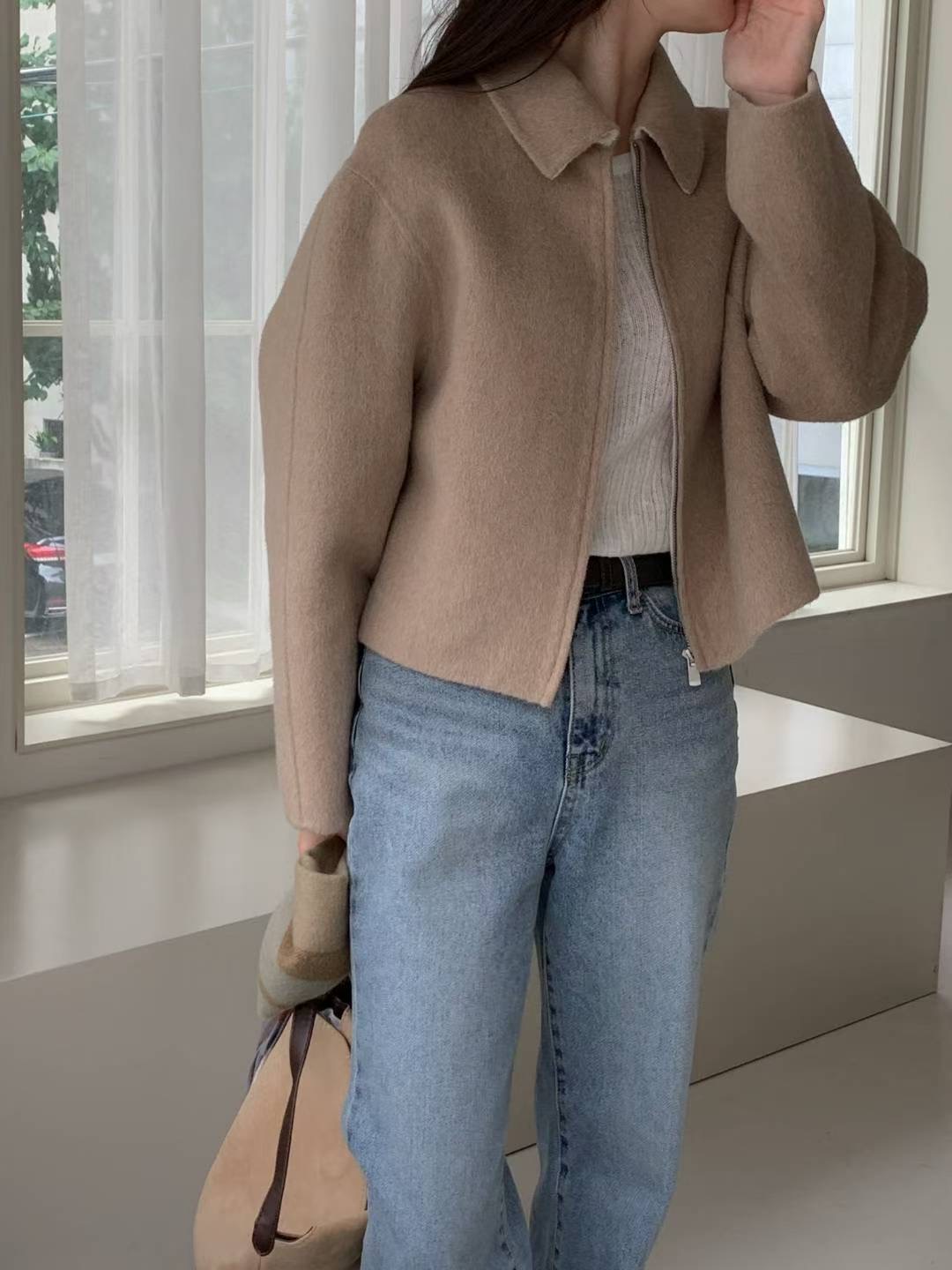 雙向拉鍊壓線連帽針織外套+落地長褲SET