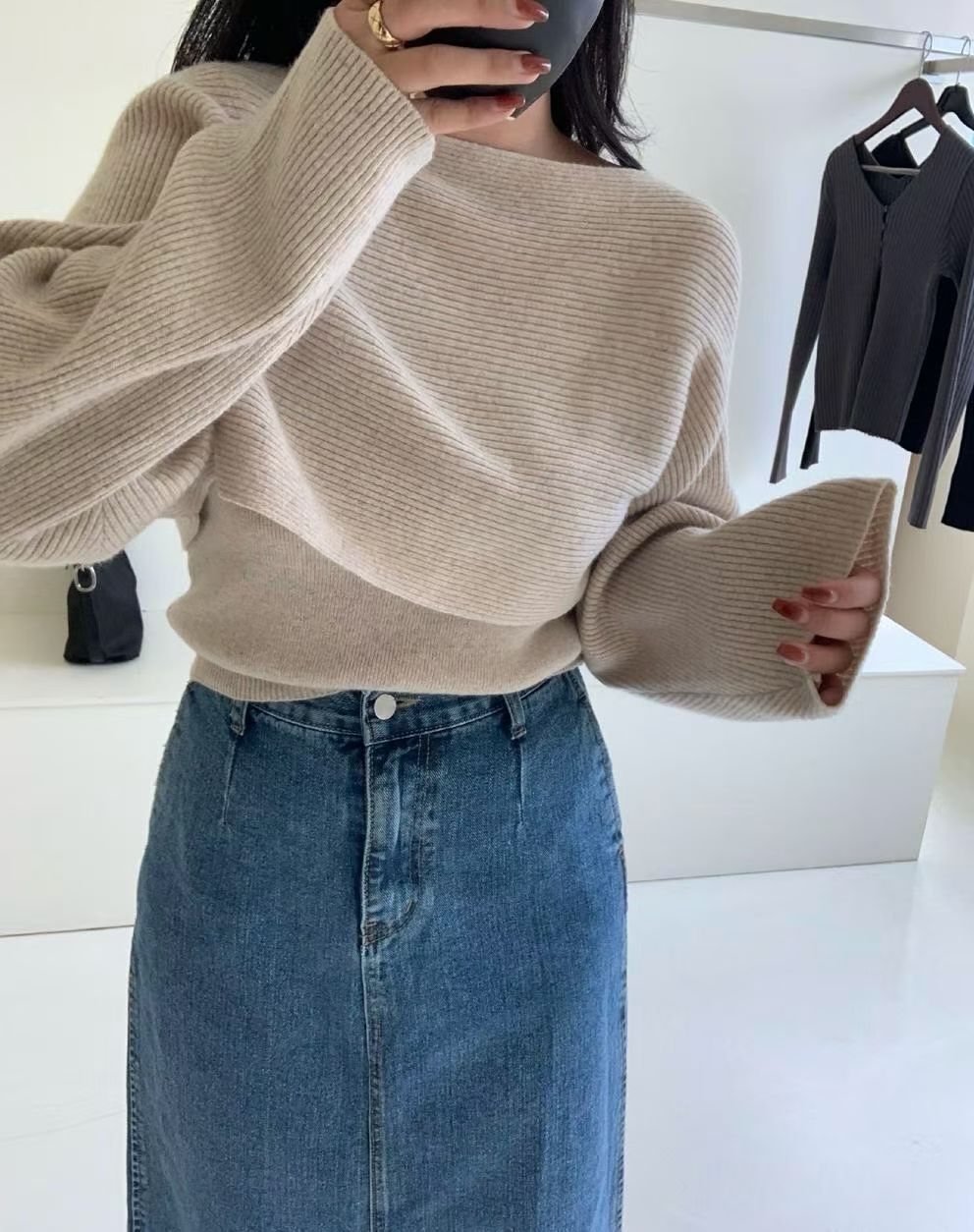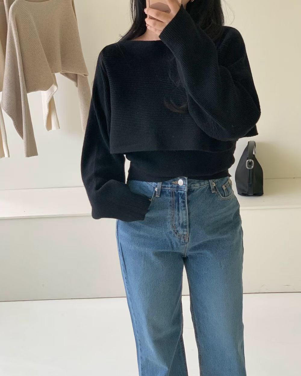 可拆式拼接襯領針織衣+鬆緊短裙SET