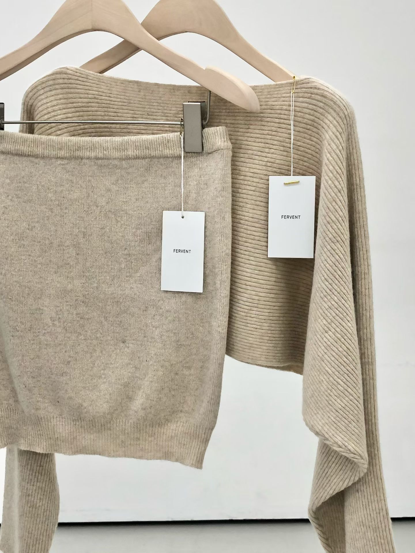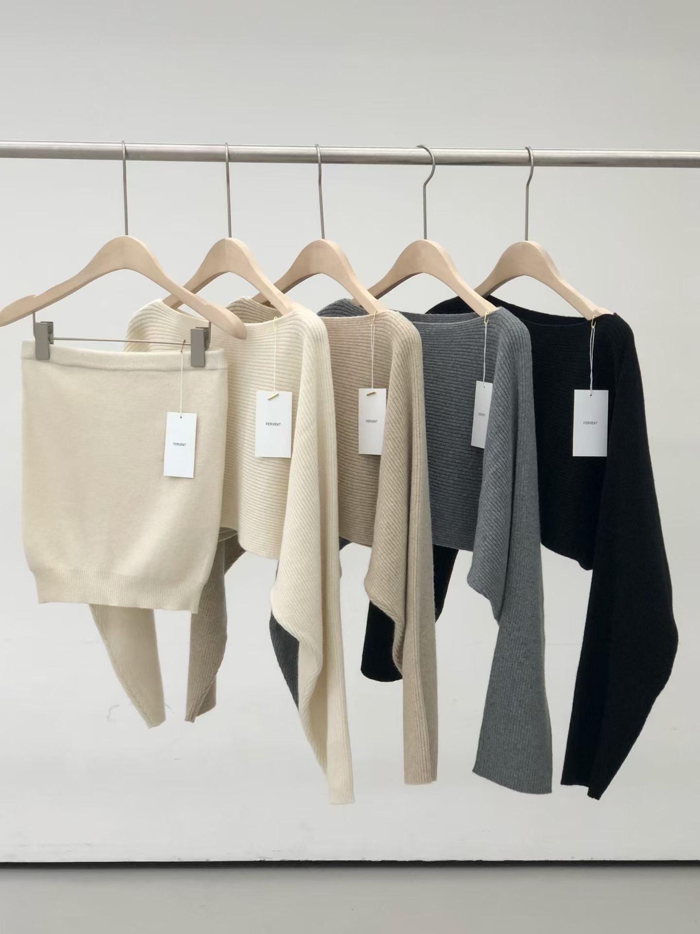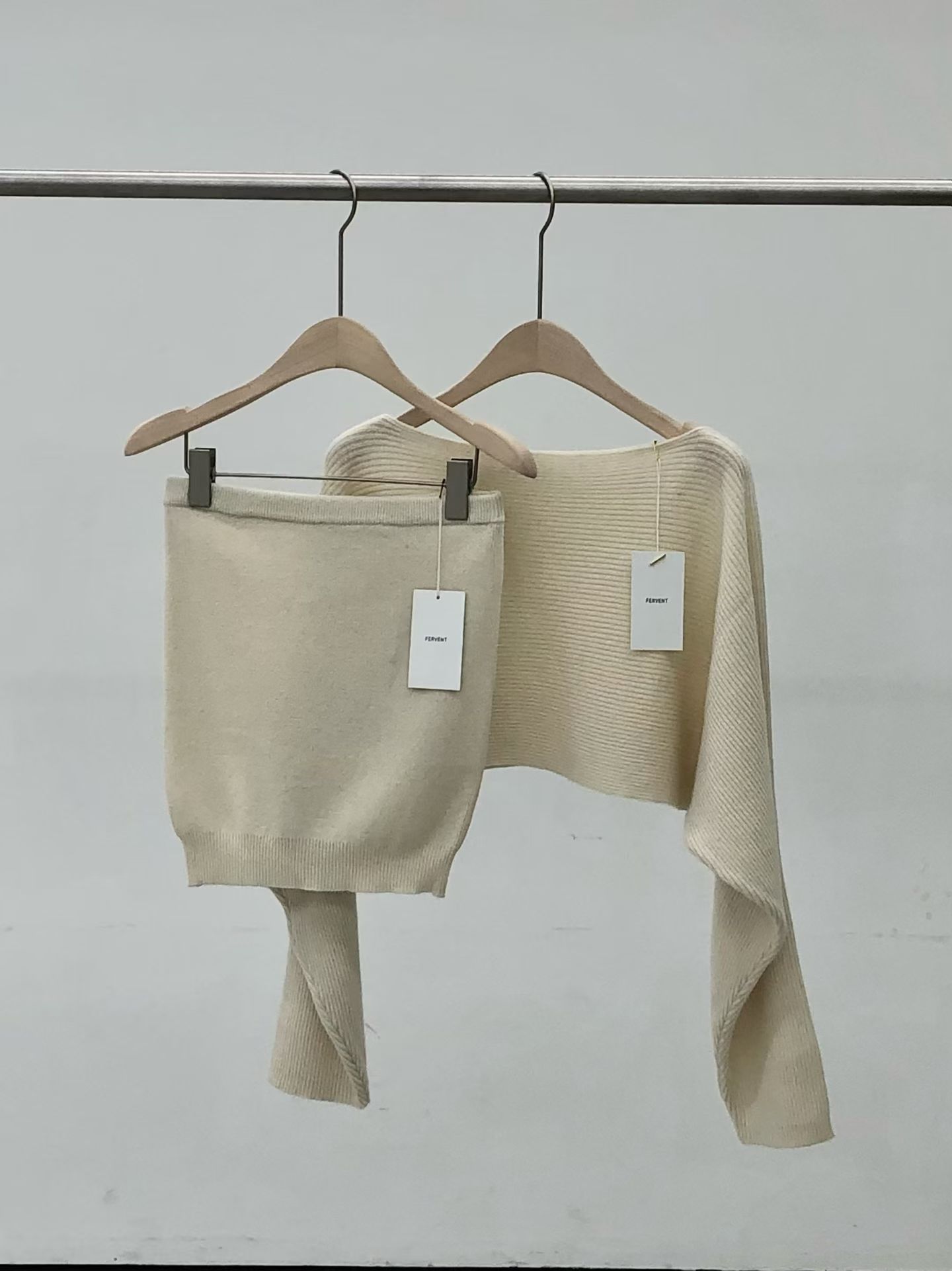 短毛圓領排釦針織衫+鬆緊A字短裙SET