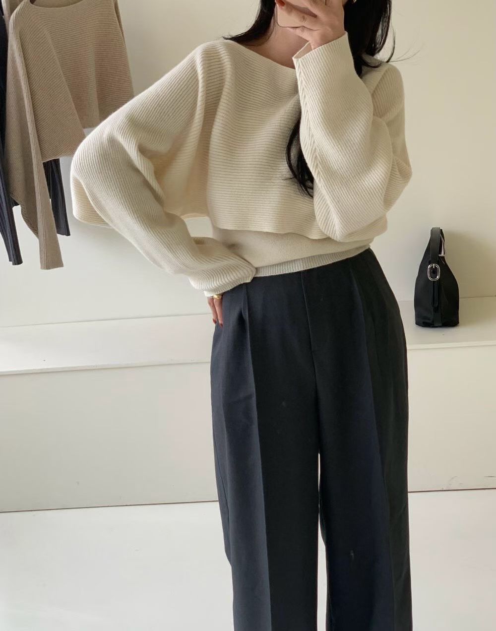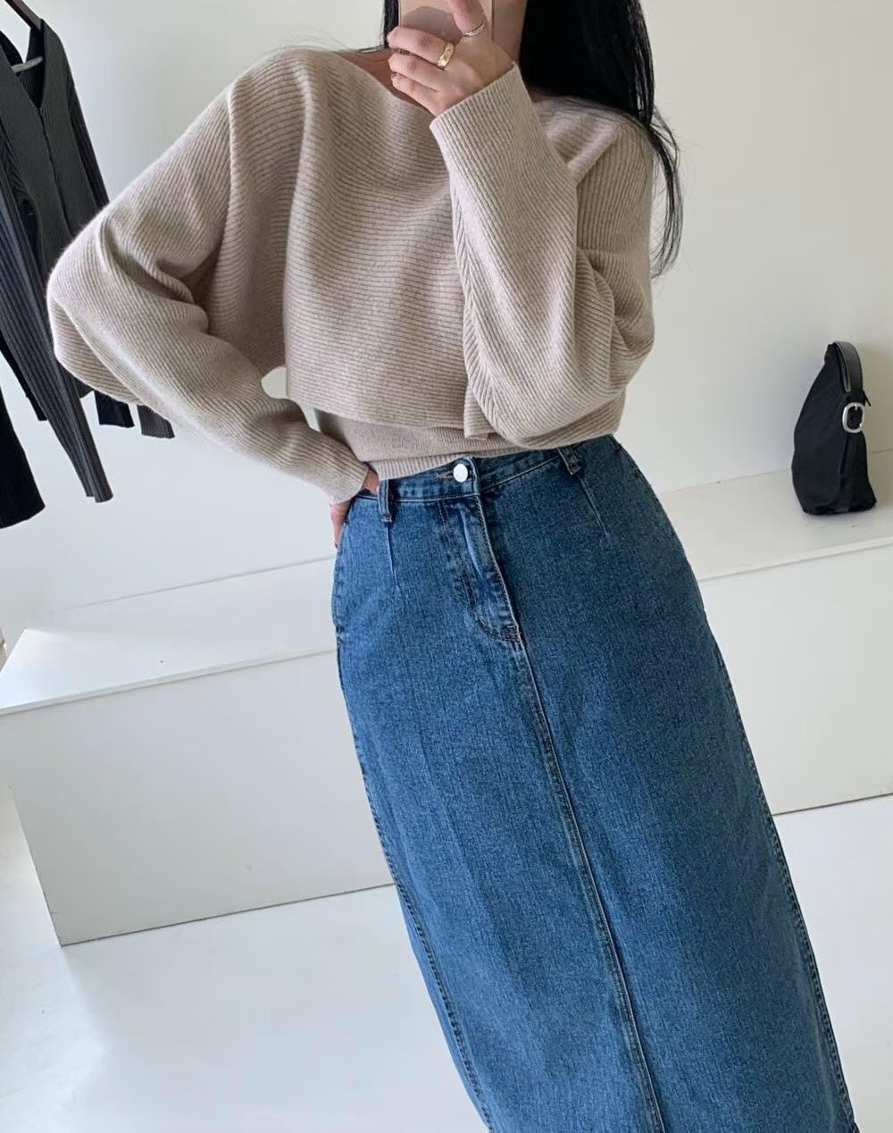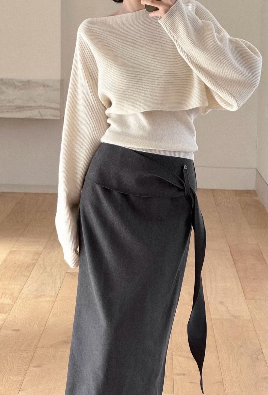 斜肩寬版短腰薄T+低腰抽繩長裙SET