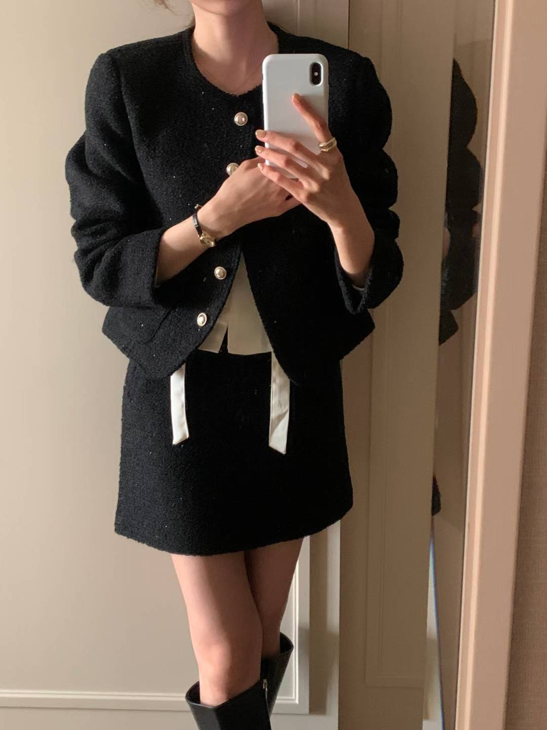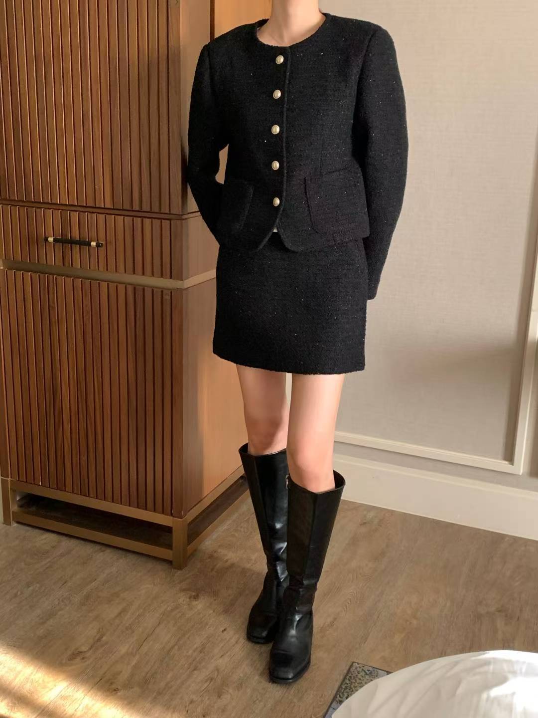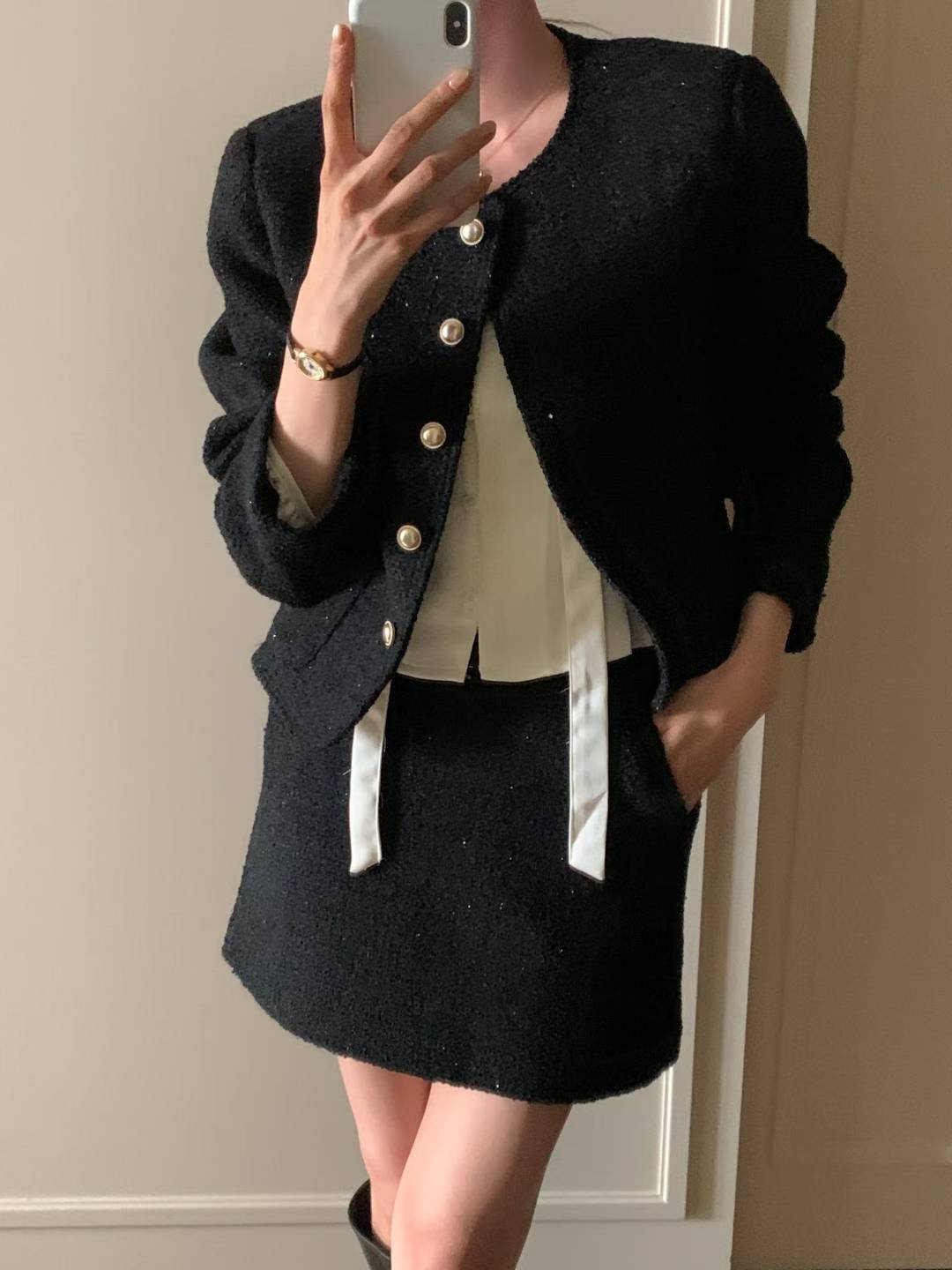 圓領銀扣金蔥小香外套+織紋短裙SET