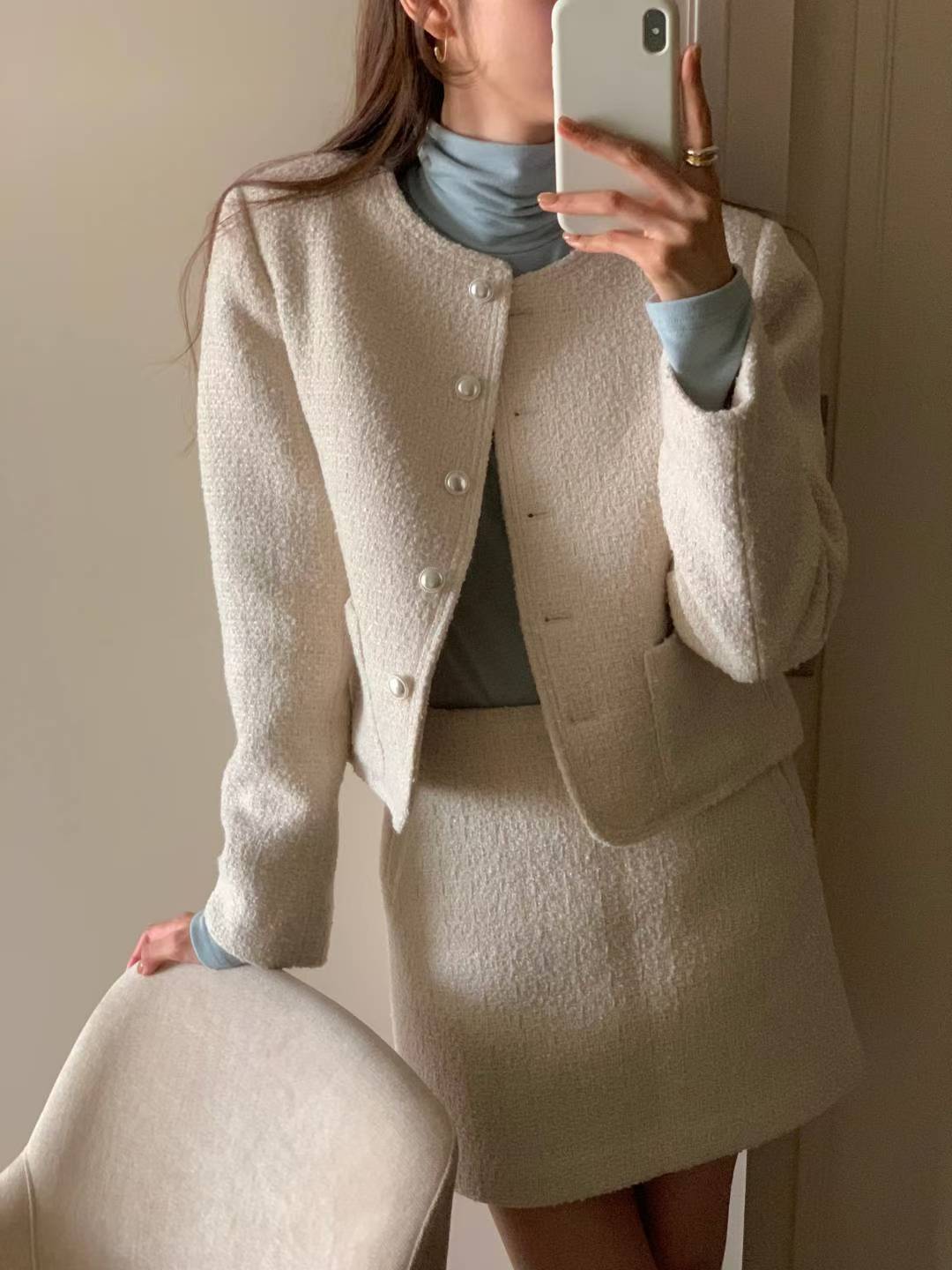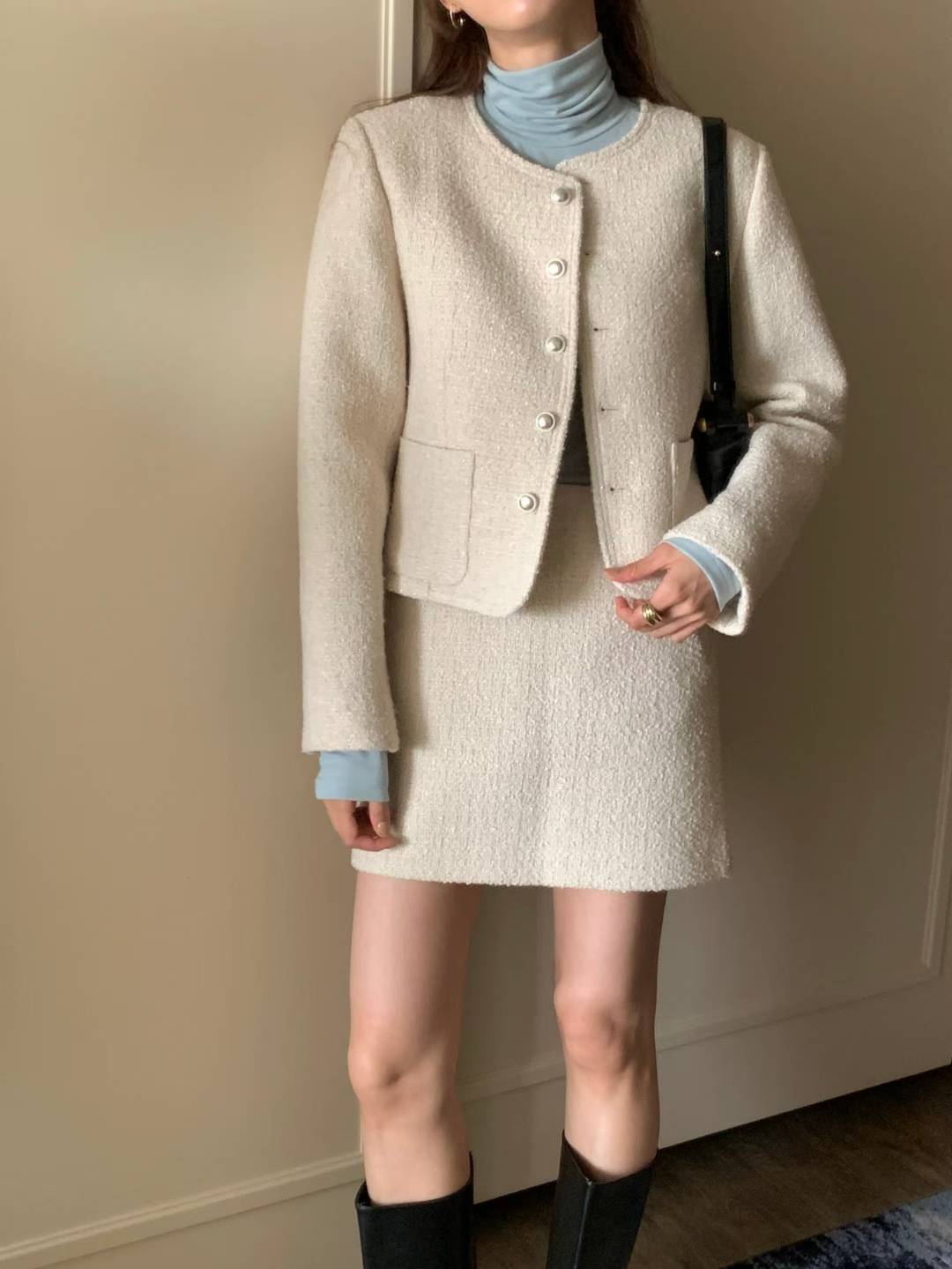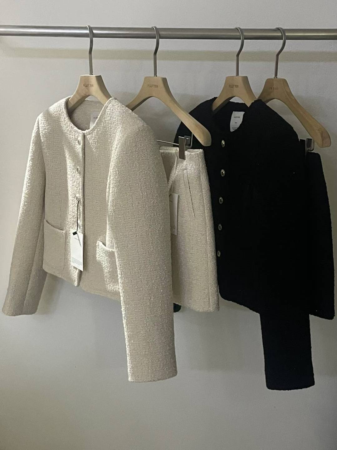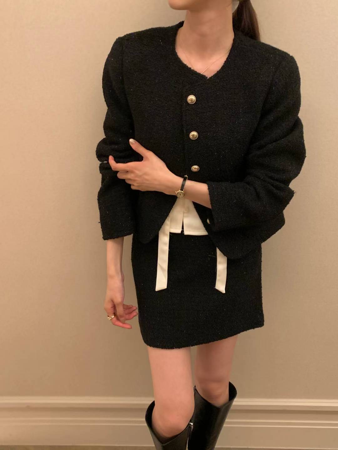 圓領銀扣金蔥小香外套+織紋短裙SET