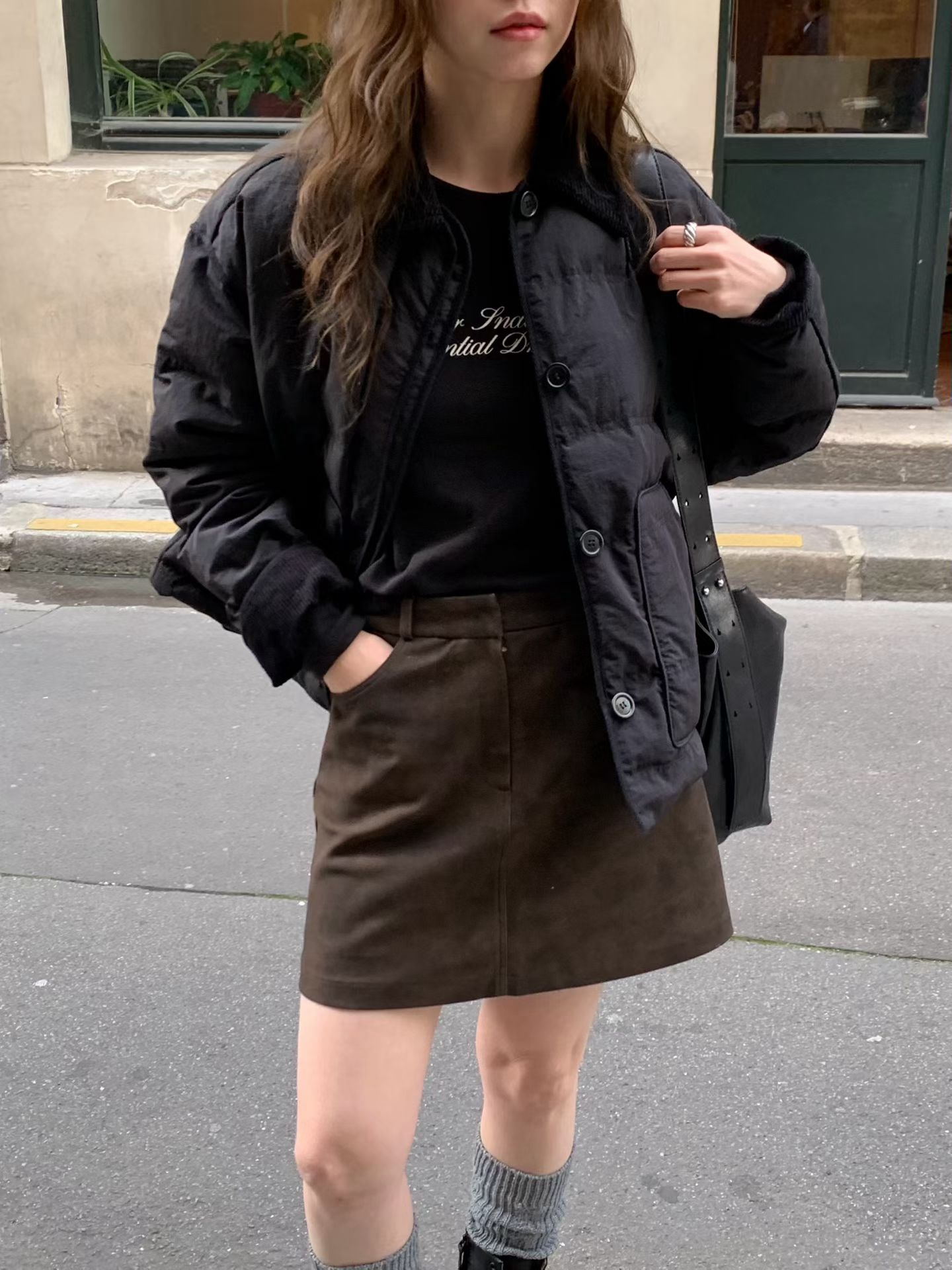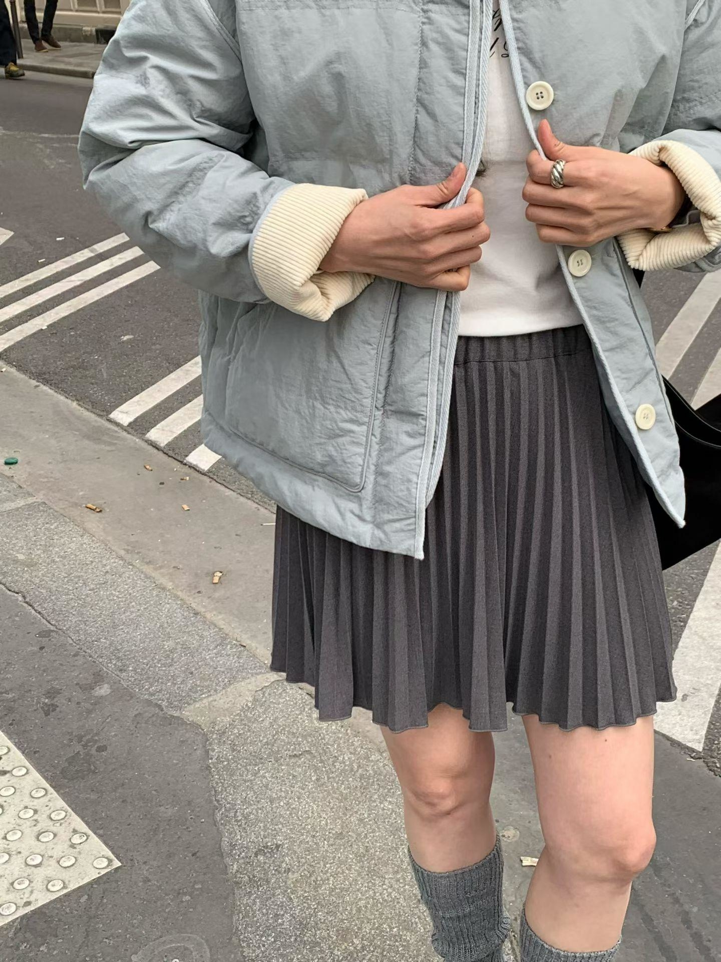 翻領設計風衣外套+不規則側排釦鬆緊短裙SET