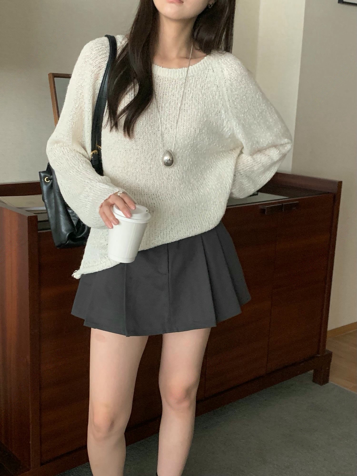 大圓領落肩坑紋針織衣(附綁帶)