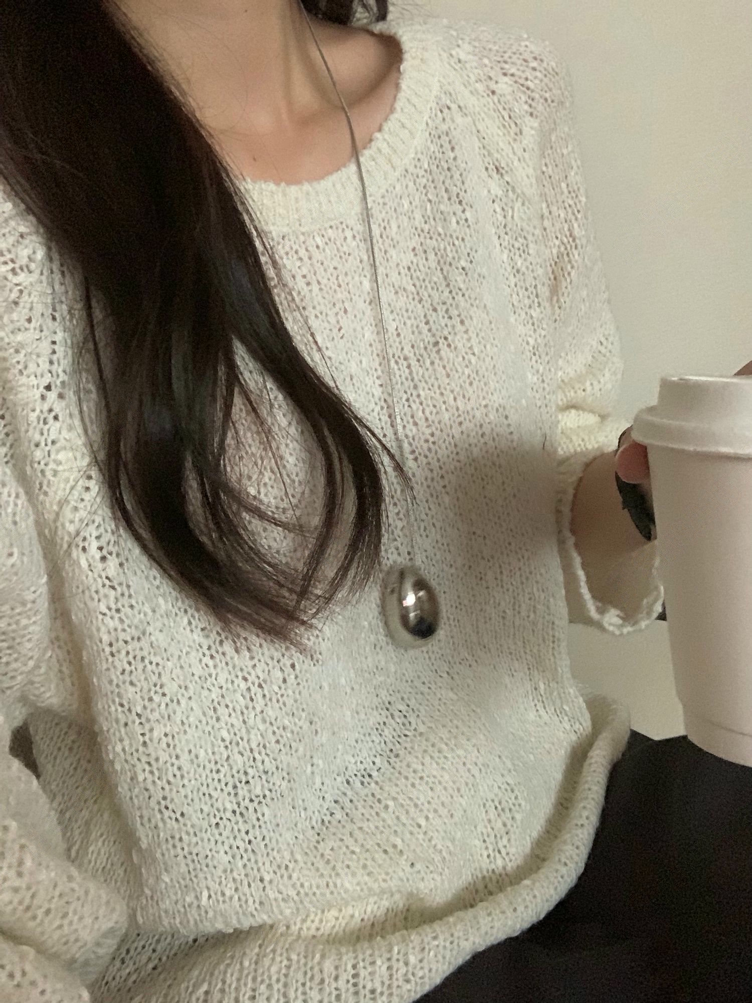 V領落肩寬鬆鏤空針織衫