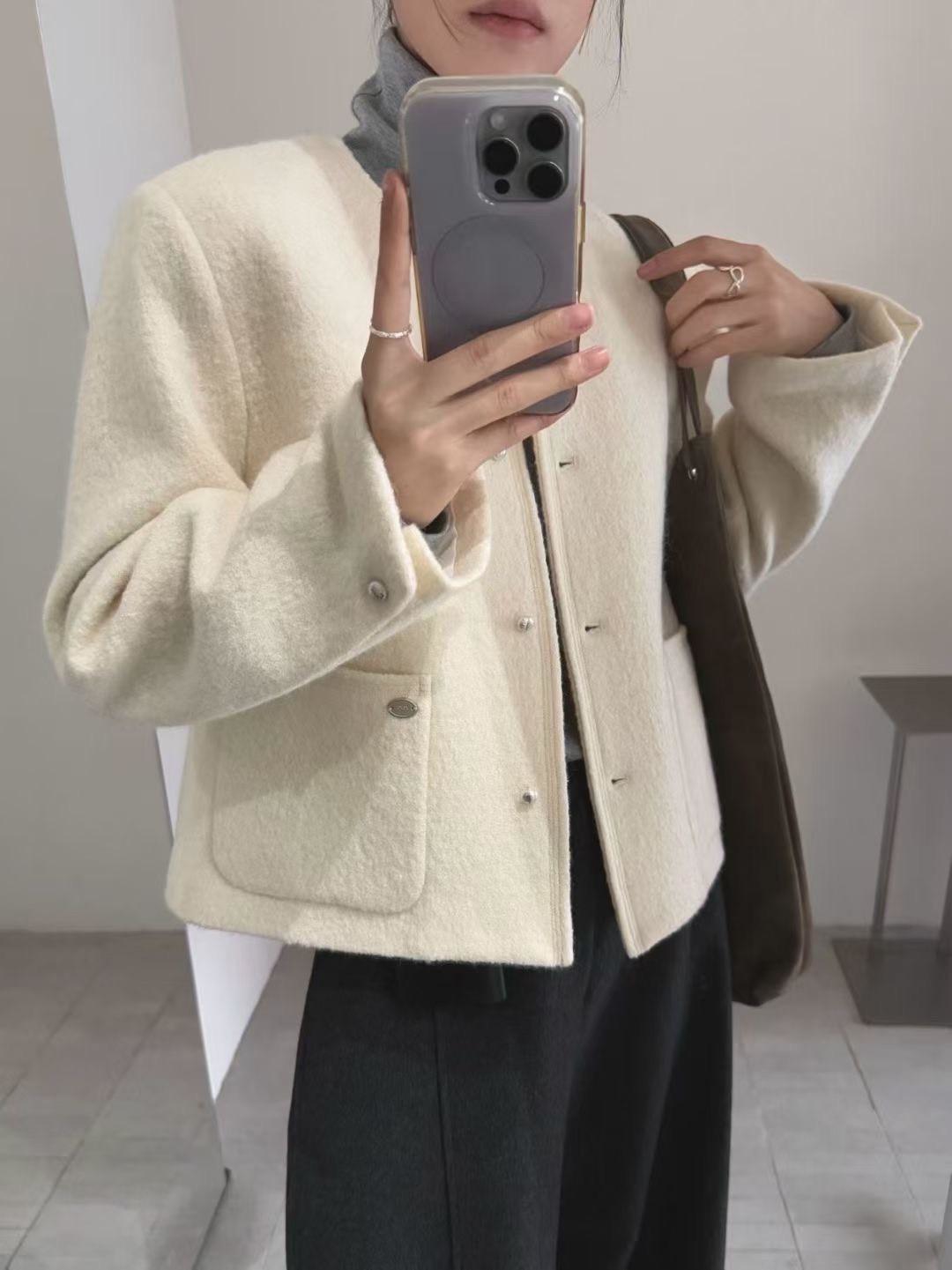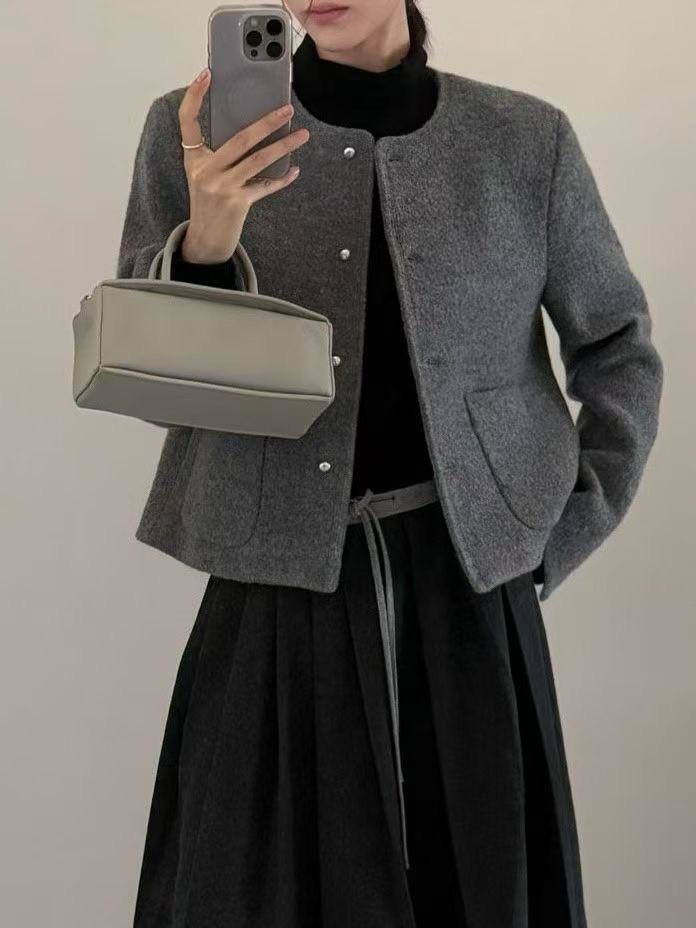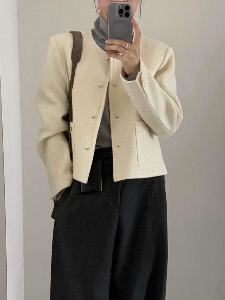 壓線雙口袋羊毛短版大衣外套