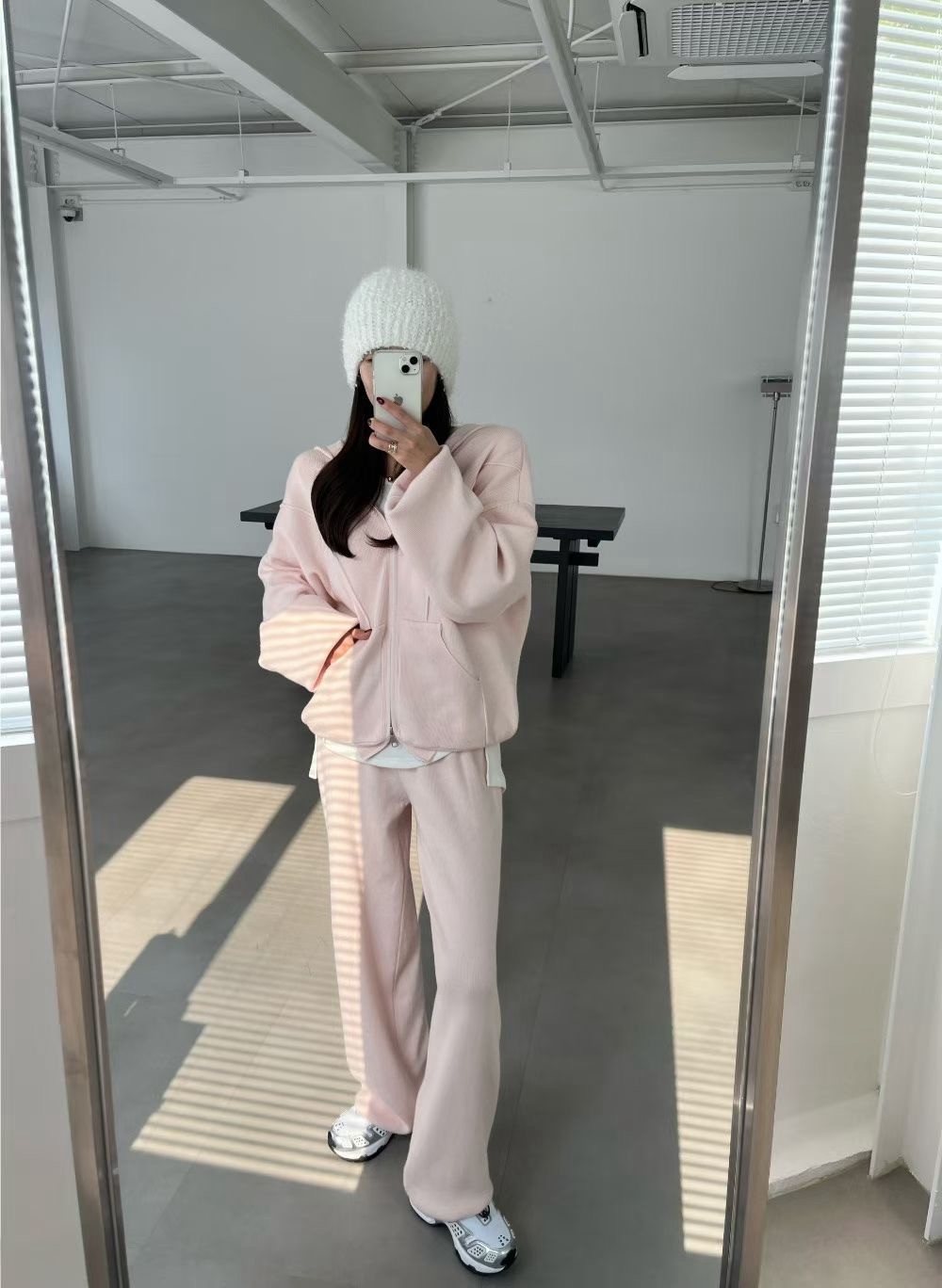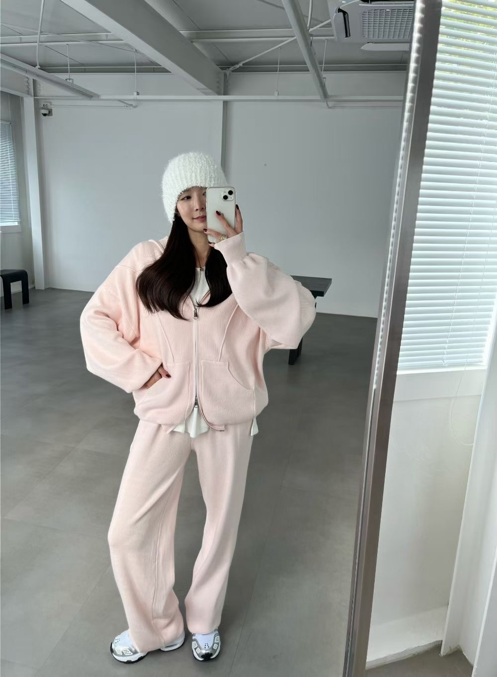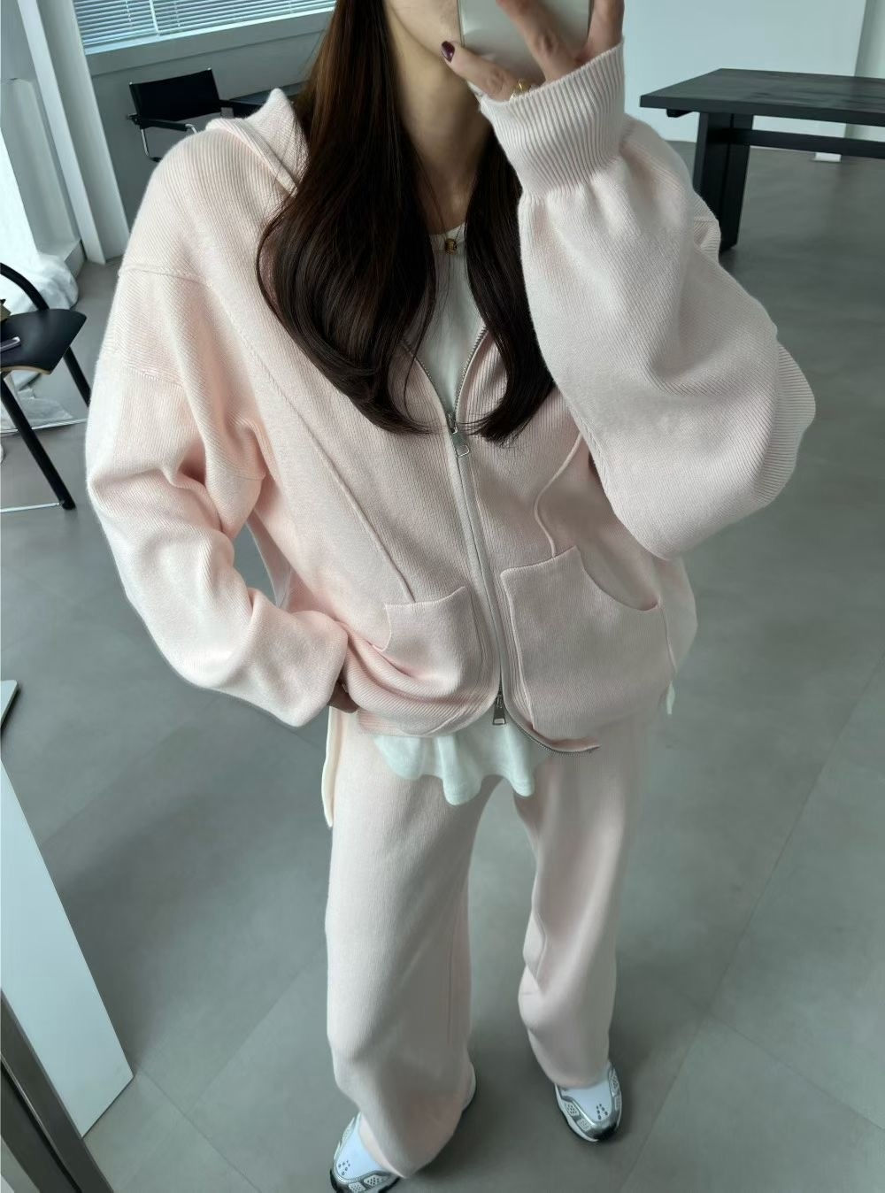 雙向拉鍊壓線連帽針織外套+落地長褲SET
