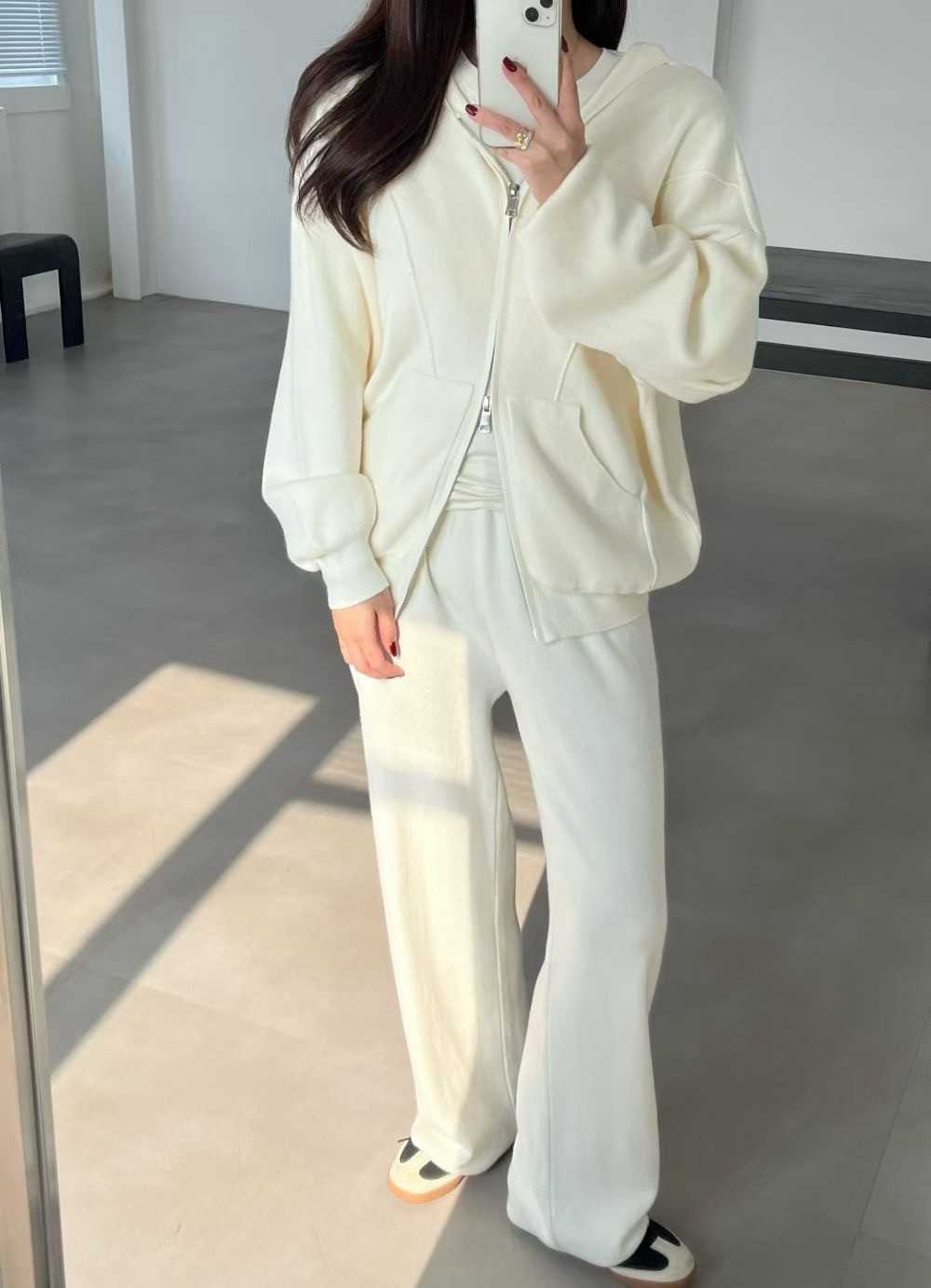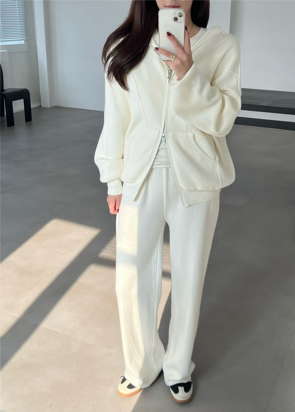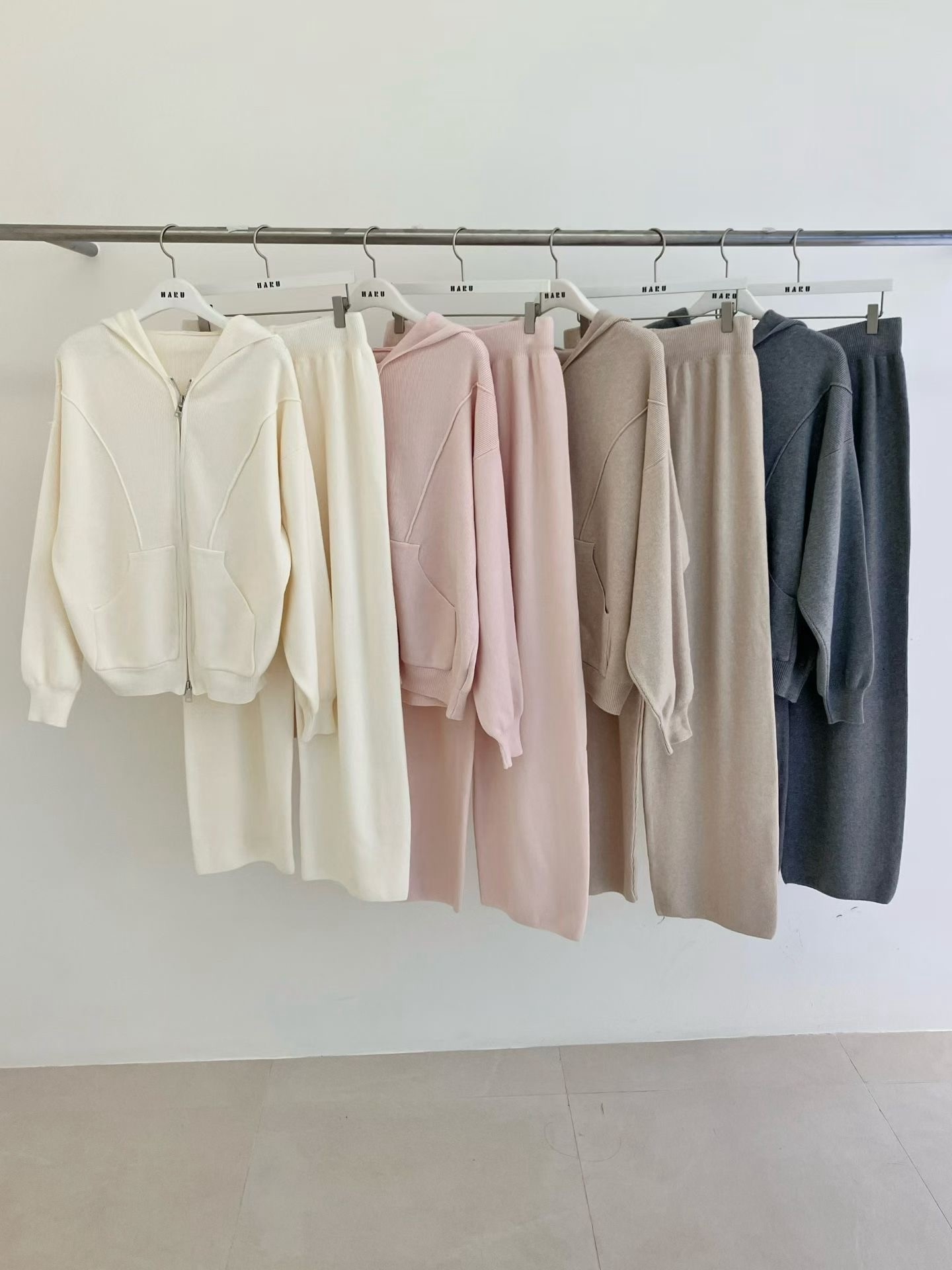雙向拉鍊壓線連帽針織外套+落地長褲SET